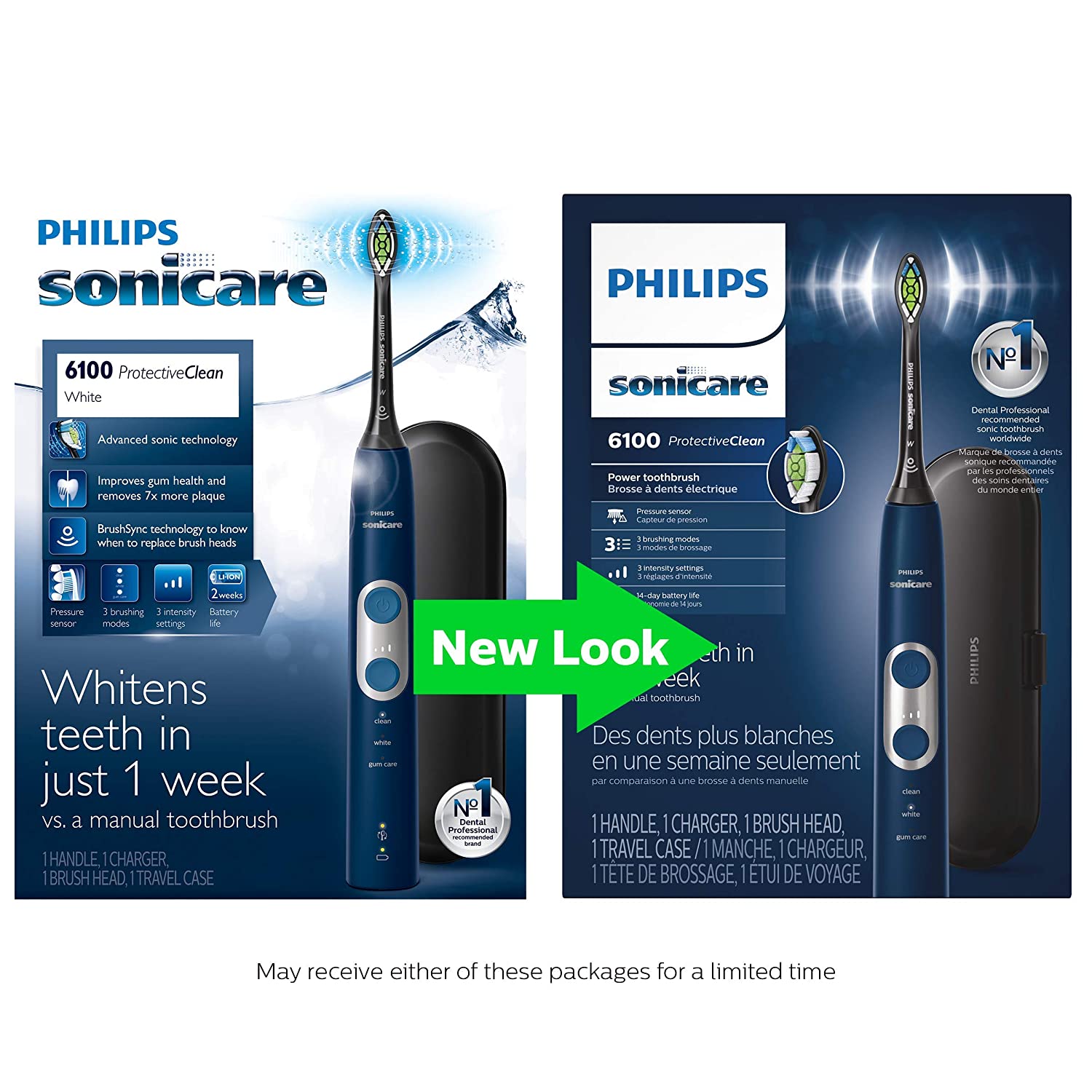 ProtectiveClean 6100 rechargeable electric toothbrush delivers up to 100% less stains in just 7 days to whiten your teeth in just 1-week vs a manual toothbrush. It has a pressure sensor that protects teeth and gums from excess brushing pressure. Brush heads wear out over time. Our BrushSync technology tracks how long you have been using your DiamondClean brush head and how hard you have been brushing. It will beep to inform you when to replace your brush head. Customize your own brushing experience with intensity settings and your choice of 3 modes: Clean, White and Gum Care. The easy-start feature slowly increases the power of the brush as you get used to the Sonicare experience and the smartimer encourages a full 2 minutes brushing time as recommended by your dental professional. The battery charge indicator light lets you know when it is time recharge; 2 week battery life. The kit includes 1 ProtectiveClean 6100 handle, 1 DiamondClean brush head, 1 charger, 1 travel case. Subscribe & Save on genuine Philips Sonicare brush head replacements and save up to 15%.
