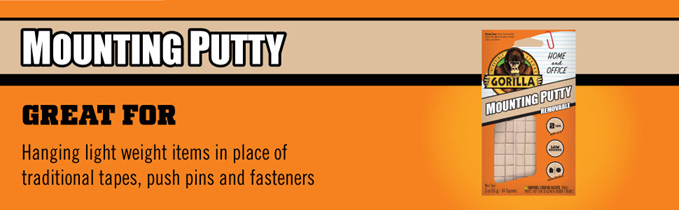 Gorilla Mounting Putty is ideal for hanging light weight items in place of traditional tapes, push pins, and fasteners. Squares are non-toxic, repositionable, and long lasting. Great for use indoors and temporary outdoor use. Use on paper, painted walls, wood, tile, metal, posters, plastic, glass, and more!