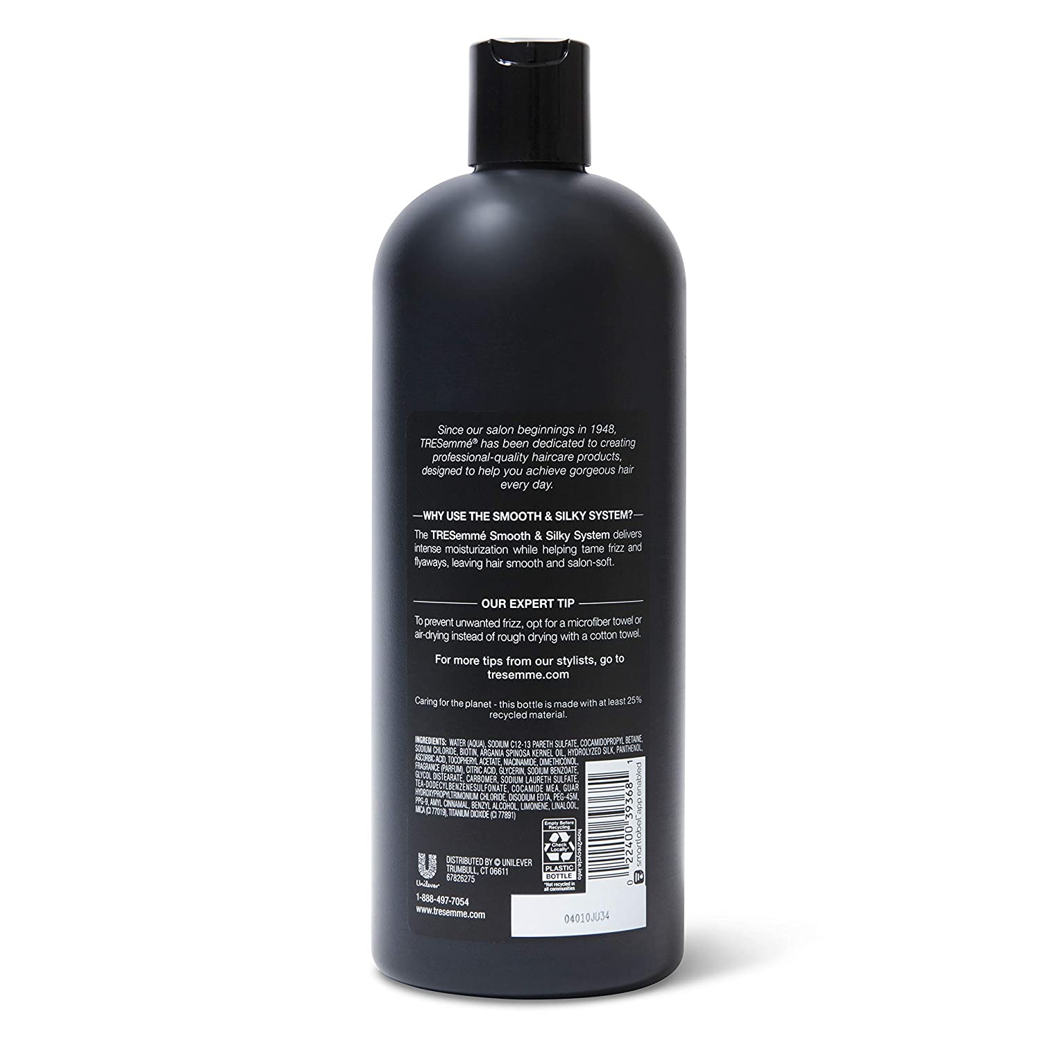 Want to restore moisture lost from heat styling? Try TRESemmé Smooth and Silky to quench dry hair and tame unruly hair. TRESemmé wants you to look and feel your best, which is why the TRESemmé Smooth and Silky System delivers optimized hydration that targets dryness and locks in moisture where your hair needs it most—every day. Enriched with Moroccan Argan oil, this gentle shampoo is designed to deliver optimum hydration that targets dryness and seals in moisture. The lightweight formula means you can turn dry, damaged hair into soft, manageable strands with beautiful shine. It’s also safe for colored hair. How to use the Smooth and Silky System: Step 1: Coat hair with a liberal amount of TRESemmé Smooth and Silky Shampoo. Step 2: Gently massage the scalp and roots with fingertips to work into a lather. Step 3: Lightly squeeze the shampoo from roots to ends and rinse thoroughly. Step 4: Apply an adequate amount of Smooth and Silky Conditioner from mid-shaft to ends. Step 5: Run a wide-tooth comb or fingers from roots to ends to detangle and fully coat hair. Leave for 2-3 minutes, then rinse thoroughly. Step 6: Finish with your favorite TRESemmé styling products as desired. Are you looking for a moisturizing shampoo for damaged hair? The clear choice is TRESemmé. Use TRESemmé Shampoo with TRESemmé's salon-quality hair styling products to perfect your look. These professional, salon-quality hair care products are deep conditioning hair products for dry hair without the salon price tag. TRESemmé Smooth and Silky Shampoo and Conditioner system delivers intense hydration that calms frizz and tames pesky flyaways, all while yielding up to 7x smoother hair, vs. non-conditioning shampoo. Ever since our origin in salons, TRESemmé has been driven by a simple truth: every woman deserves to look and feel their best, and that usually starts with a good hair day.