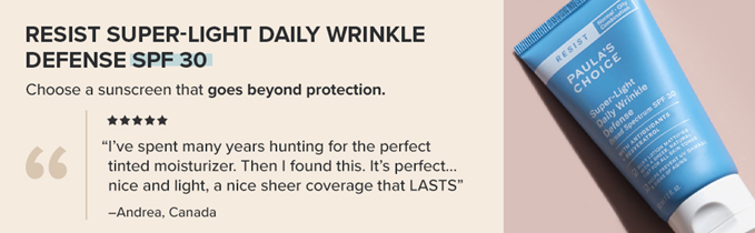 Paula's Choice RESIST Super-Light Daily Wrinkle Defense SPF 30 Tinted Matte Moisturizer with Antioxidants & Resveratrol is formulated to repair & renew sun damaged skin while preventing further damage, minus the white cast associated with most sunscreens.