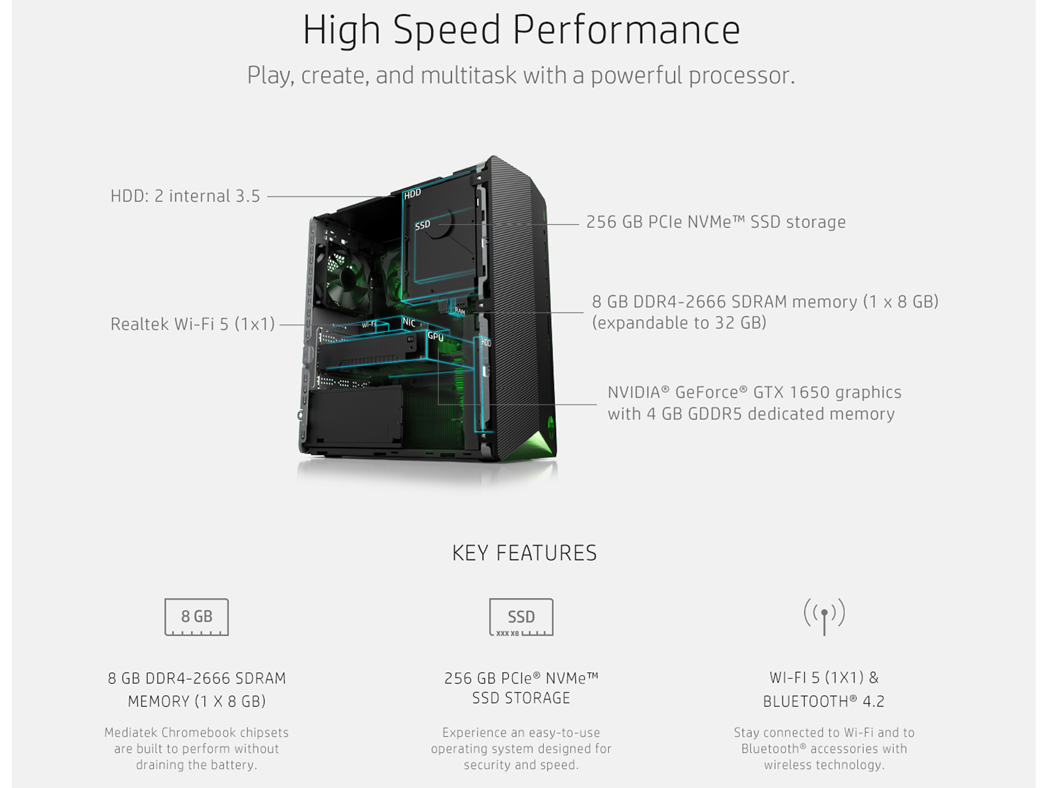- PC GAMING CONNECTIVITY – Enjoy rock-solid connections with the latest Wi-Fi 5 (1x1) WLAN adapter and Bluetooth 4.2 as well as reliable external ports in the Headphone/Microphone combo, 5.1 surround sound, and SuperSpeed USB Type-A and Type-C ports; this pc is perfect for dual display support