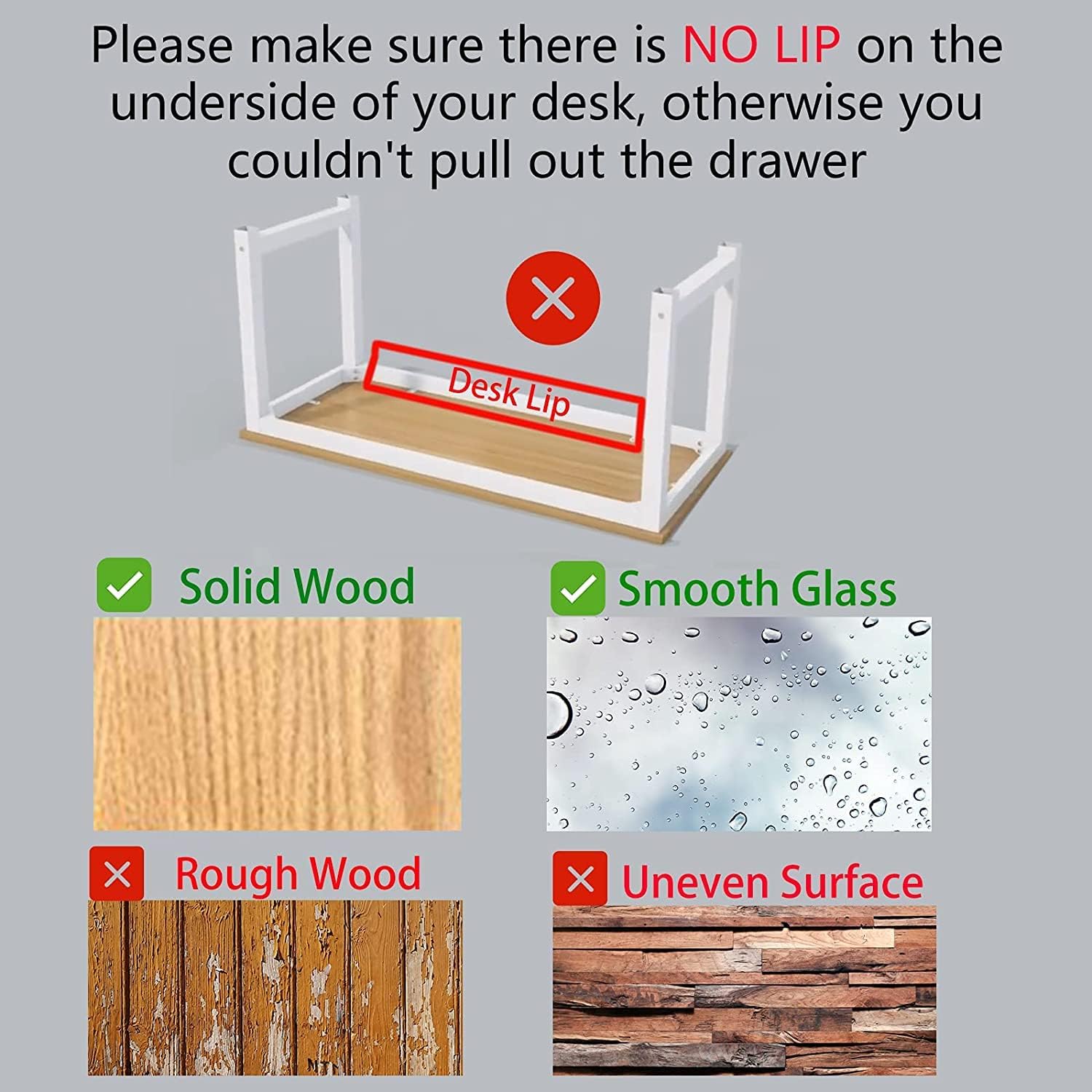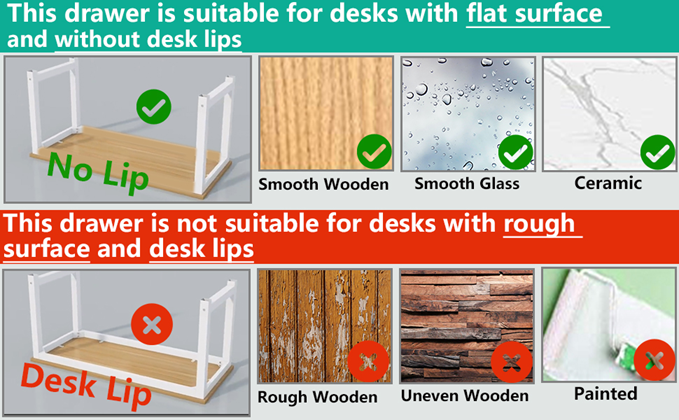 - 【Warning】This under desk organizer is Not suitable for desk with lips and rough surface.