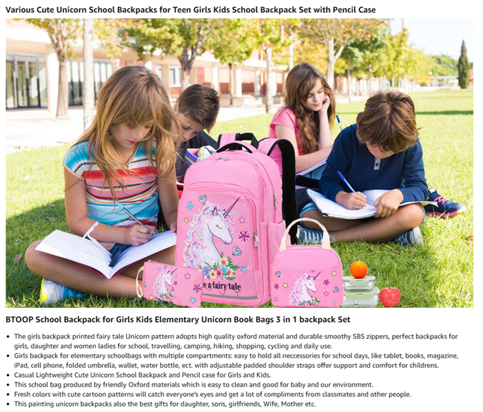 Material: This girl unicorn backpack is well made of high quality and durable Oxford with fairy tale unicorn printing, it would not fade. The 3 IN 1 kindergarten backpack set include girls Backpack + Insulated lunch tote Bag + Pencil pouch also as purse, perfect for girls to use at school days.