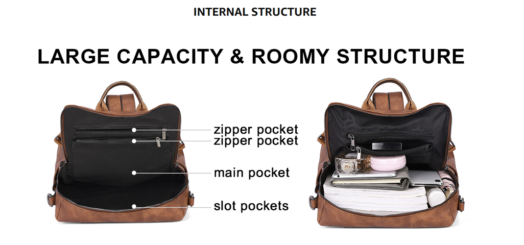 • Multiple Compartments: 1 main compartment with 2 inner zipper pockets, 2 inner slot pocket, 1 front zipper pocket, 1 buckle front pocket, 2 side pockets and 1 back zipper pocket. Different sizes' pockets are enough to hold your items like 14" or under laptop, iPad, books, umbrella, cosmetics, keeping them well organized.
