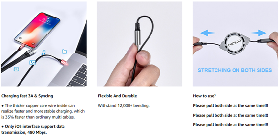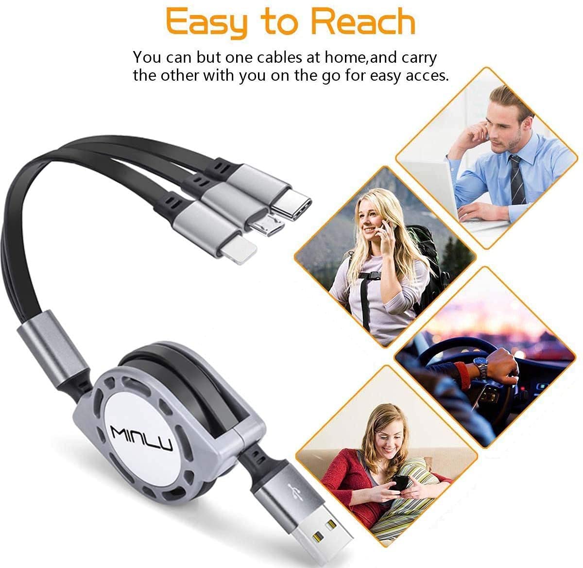 ● 4Ft/120cm is perfect length for long distance charging, 3-in-1 retractable design, makes the cord portable and only need one cable when you are on a business trip or traveling.
