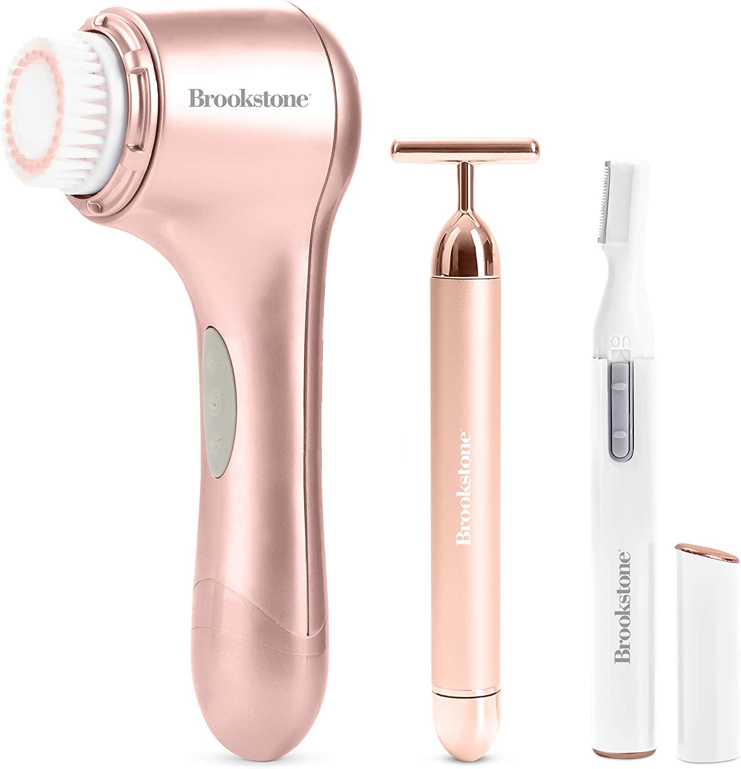 Brookstone 3-in-1 Rose Gold Facial Skin Care Set | Facial Skin Care Products Include Facial Cleansing Brush, T-Bar Face Massager and Facial Epilator | Perfect Gift