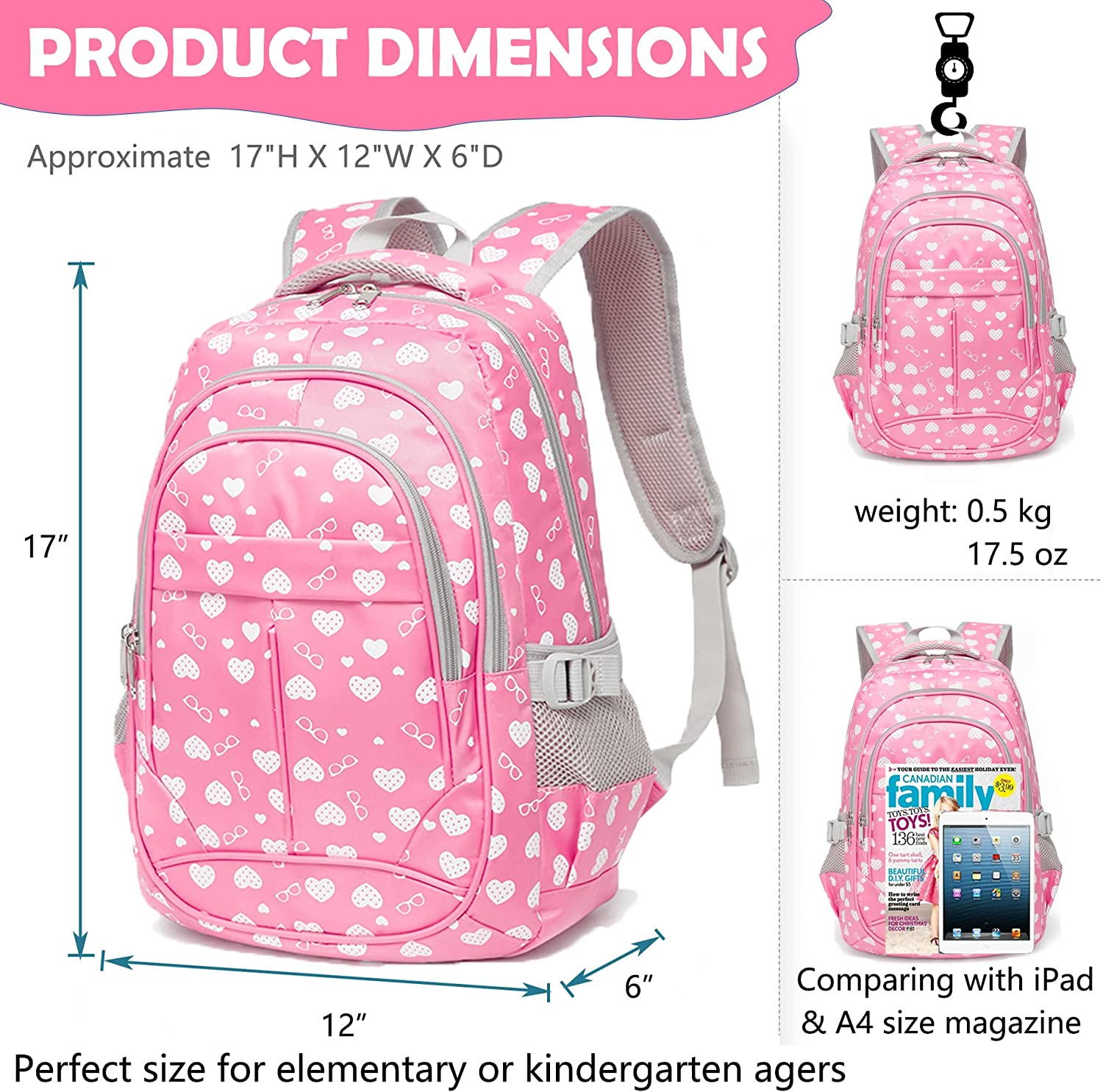 ? 【 APPROXIMATE DIMENSIONS & LIGHTWEIGHT 】-- This girls backpack Dimension: 17"H X 12"W X 6"D. A lightweight and durable daypack that goes from school to fun as quickly as you do with the comfortable straight-cut padded shoulder straps, padded back panel, and a quick grab web haul handle .