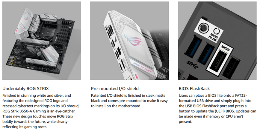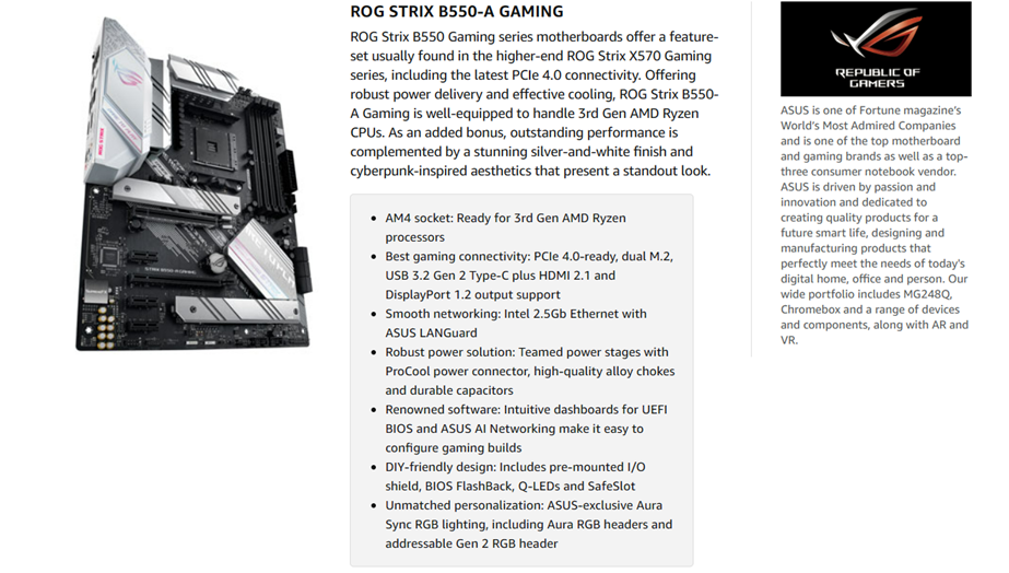 Experience next-level performance and connectivity with the ROG Strix B550-A Gaming, featuring PCIe® 4.0 and 2.5Gb Ethernet. Robust power and effective cooling make the ROG Strix B550-A Gaming the perfect partner for 3rd Gen AMD Ryzen™ CPUs. Futuristic aesthetics, intuitive software, and a reliable Stack Cool 3+ design put your build in the winner’s circle. Free 3-months Adobe Creative Cloud Subscription: Receive complimentary access with the purchase of this product (offer valid from 9/15/2021 to 9/15/2022) visit https://www.asus.com/us/content/asus-offers-adobe-creative-cloud/ to claim.