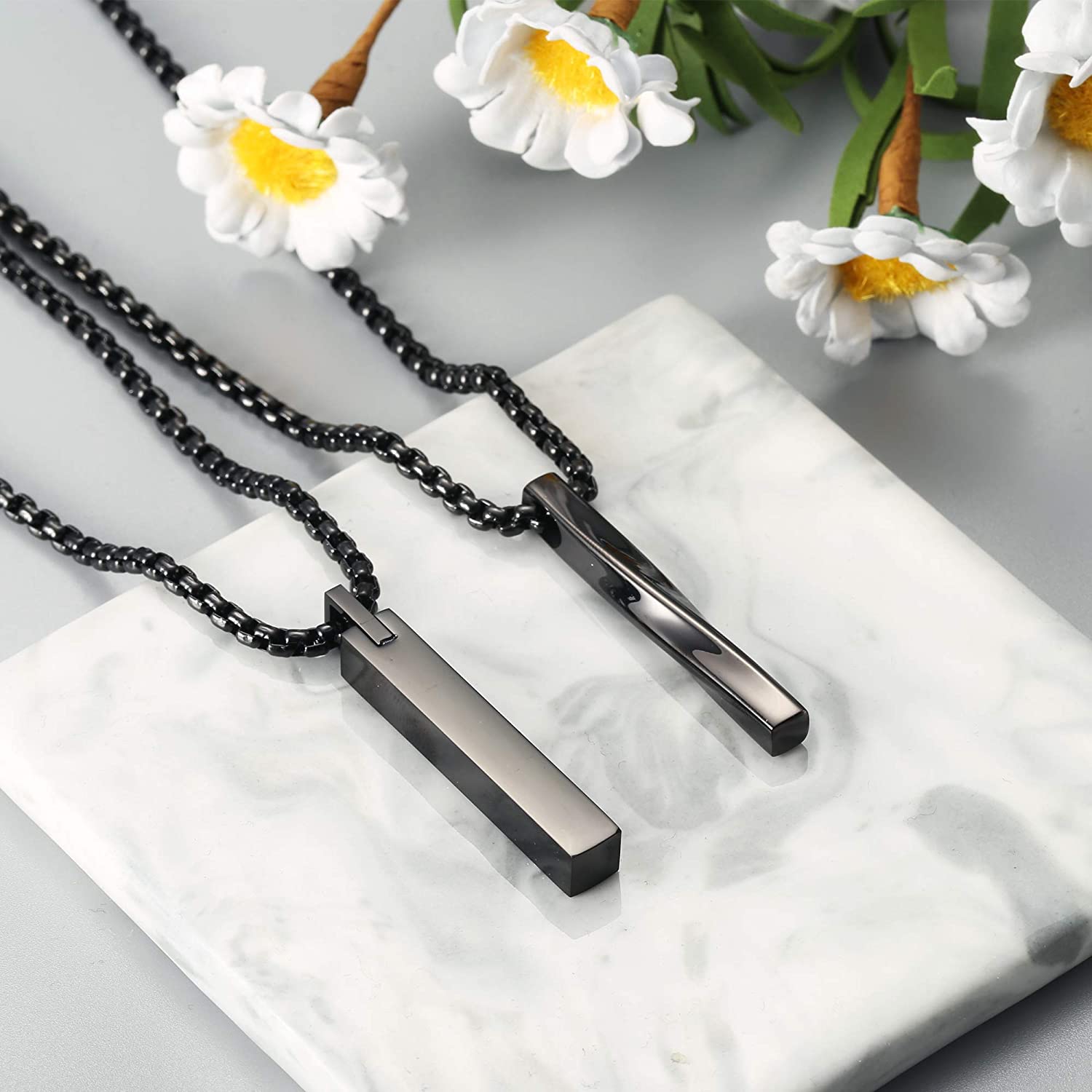 PRODUCT SIZE--Thick Bar Pendants Size: length: 40mm,width: 5.8mm,thick:5.8mm; Twisted Cube Bar Pendant Size: length: 40mm,width: 3.6mm,thick:4.6mm;All Come with a 3mm 24 inch chain. Perfect size for men and women