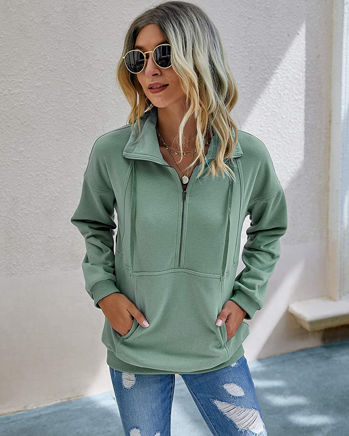Features: Half zip pullover women, Solid color cute sweatshirts for women, Lapel half zip up sweatshirt women, Womens sweatshirt no hood, Long Sleeve pullover sweatshirts for women, Ribbed cuffs, 1 front big pocket, Oversized sweatshirt for women, Soft zipper fall sweatshirts for women loose fit, Casual womens sweatshirts no hood, Drawstring neck womens oversized sweatshirts, Quarter zip pullover women