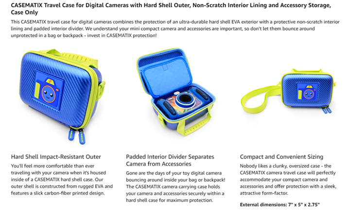 Comfortable Handle & Strap: Keep your camera safe! Our compact CASEMATIX camera case measures only 7" x 5" x 2.75" so it can be stored in toy boxes, backpacks, etc. plus it features a handle and adjustable strap!