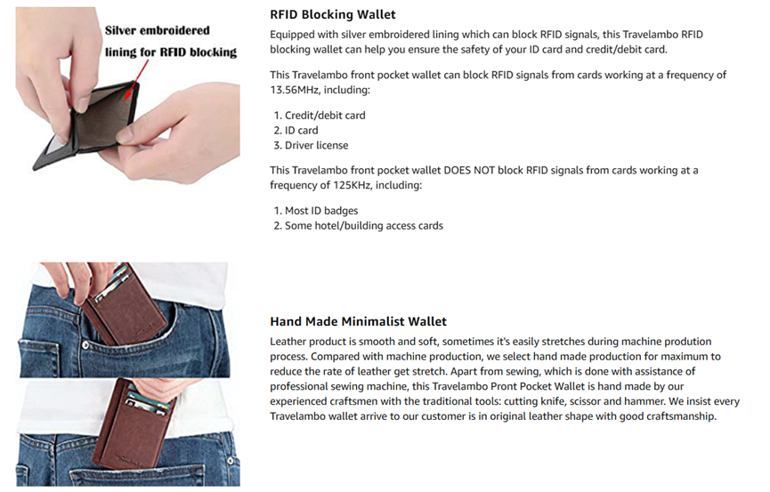 • RFID BLOCKING TESTED & APPROVED BY INDEPENDENT LAB TESTS. Our wallets have been tested for 13.56 MHz Frequency in which our credit cards, debit cards, driver license and ID cards operate. PLEASE BE NOTED THAT the signal of some ID badge, access cards and hotel room cards which operates in 142 KHz, can not be blocked by this wallet.