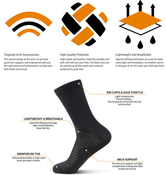 • [ARCH SUPPORT FOR YOUR FEET] The arch of the foot area is designed with a triangle-like pattern to provide support for the medial and lateral sides of the foot. Targeted arch compression keeps your arch stable and secure. Perfect for everyday use and boost your performance for any sports activity, yoga, gym, cycling, running, walking, standing, travel, or just sitting on the couch