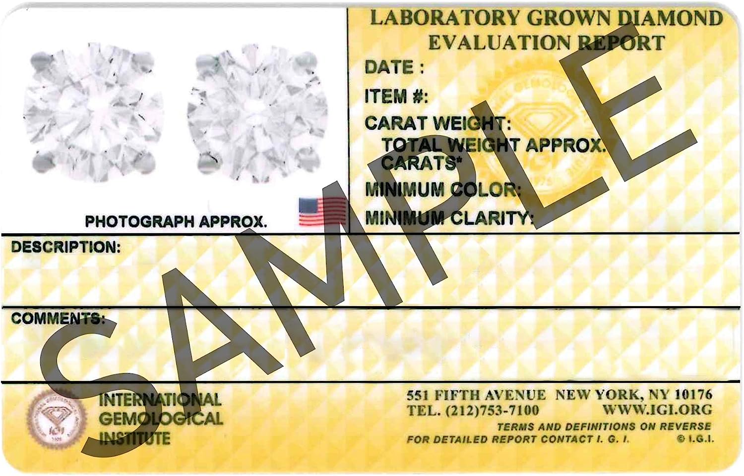 • Earrings ship complete with official certificate from the International Gemological Institute (IGI). The world's largest independent laboratory for testing and grading gemstones and fine jewelry.