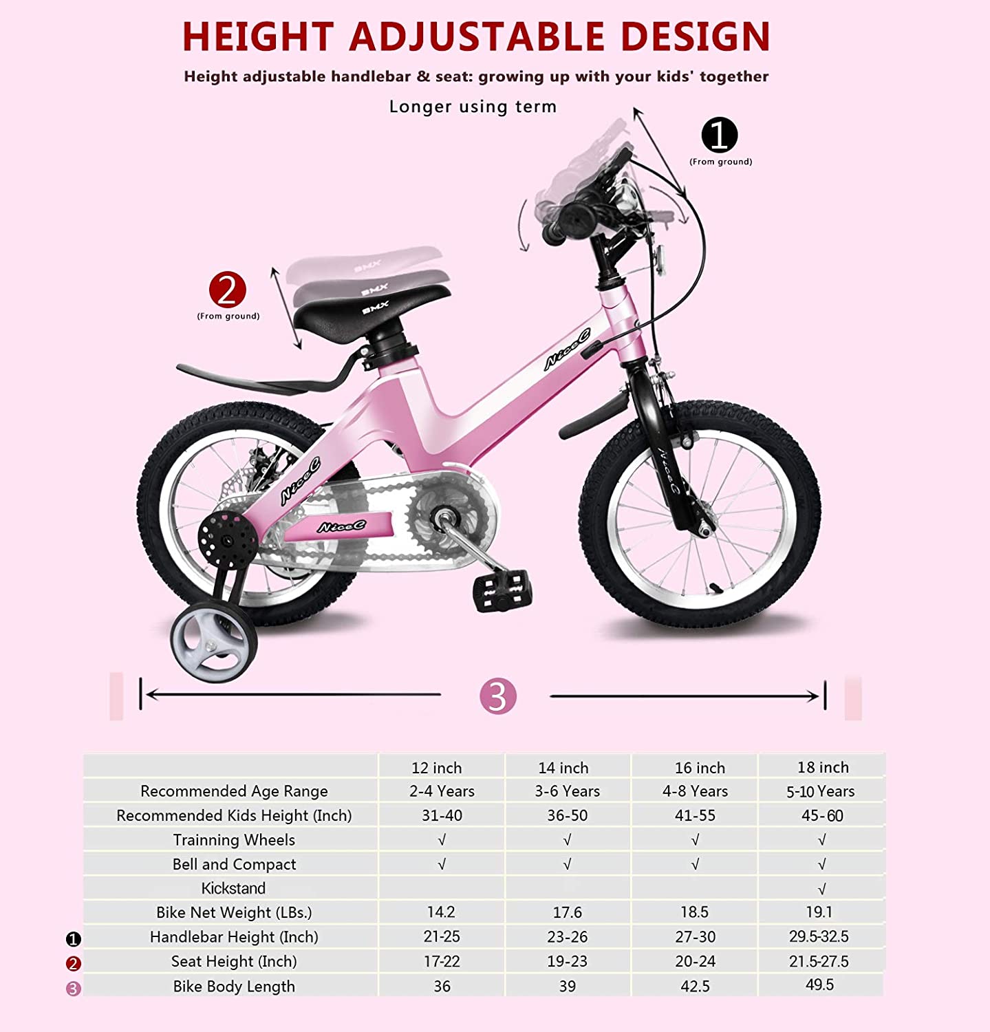 • ADJUSTABLE: Kids grow fast, so we have the perfect bike that will allow you to adjust both the handlebars and seat heights to fit your kids’ needs. For this 14 inch bike, the handlebars can be adjusted from 23-26 inches, and seat height can be adjusted from 19-23 inches. All bikes come with a page of fun stickers so they can customize their new bike.