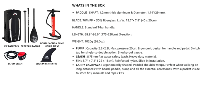 Included Components‎Safety Leash, Stand Up Paddle Board, Central Slide-in Fin, Double Action High-Pressure Pump, Sports iii Alloy 3 Piece Paddle