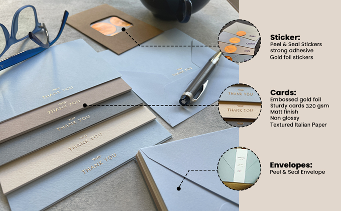 HIGH QUALITY MATERIAL - Solid and high end finish with 320 GSM Italian thick textured paper card embossed gold foil pressed. Non-glossy paper, means no fingerprints or scratches when handling these thank-you cards. Will not smudge or smear.