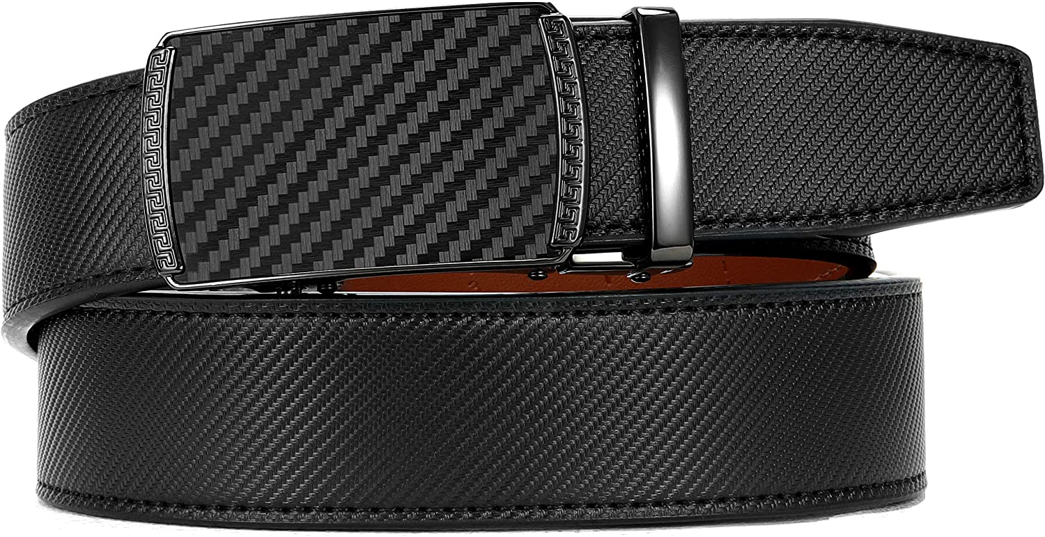 Effortless to Use: Experience the ultimate convenience with our black leather belt. Simply slide it into the sliding buckle, pull it through, and the click-it buckle automatically locks in place. Releasing the belt is just as easy - gently push the lever on the side of the automatic buckle, and the lock snaps shut. Enjoy the seamless simplicity and smoothness of our ratchet belt design.