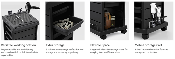 • ✅ ROLLING CART FOR EXTRA CONVENIENCE with ease and comfort. The beauty trolley's rolling wheels support all kinds of loads on hard or smooth surfaces with safety. The soft wheels provide a flexible rotation without damaging your floor.