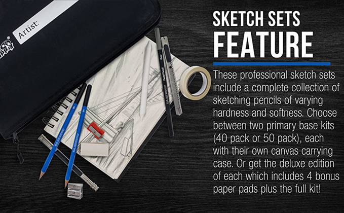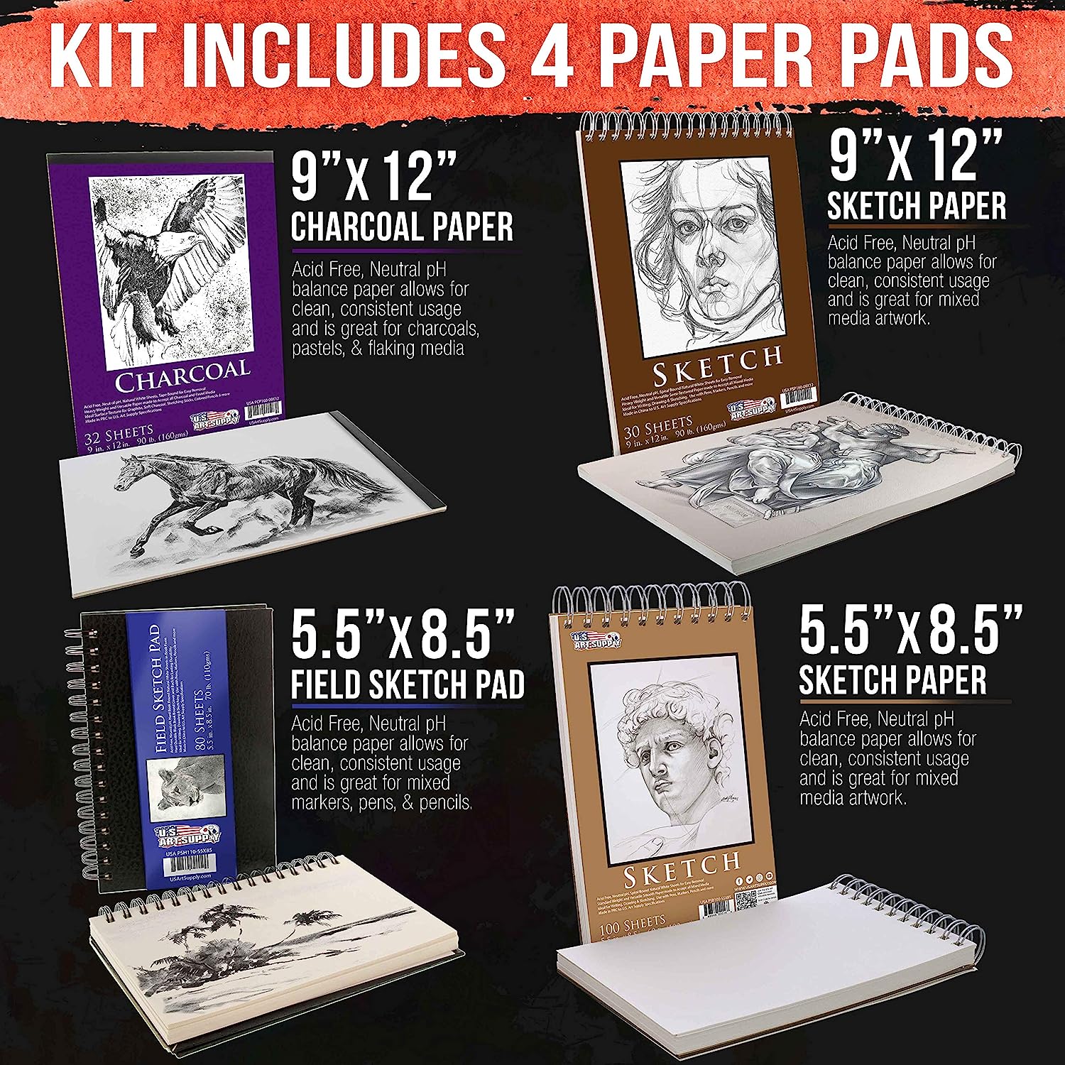 • Plus four different styles of full-size premium sketch and drawing pads: 1 - 30 Sheet, Spiral Bound 9" x 12" Premium Sketch Pad (heavy-weight, 90 lb, semi-textured paper), 1 - 100 Sheet, Spiral Bound 5.5" x 8.5" Premium Sketch Pad (standard-weight, 60 lb, smooth paper), 1 - 80 Sheet, Spiral Hardbound 5.5" x 8.5" Premium Field Sketch Pad (durable book form, 70 lb, natural white paper) 1 - 32 Sheet, 9" x 12" Premium Charcoal Pad (heavy-weight, 90 lb, natural white paper)