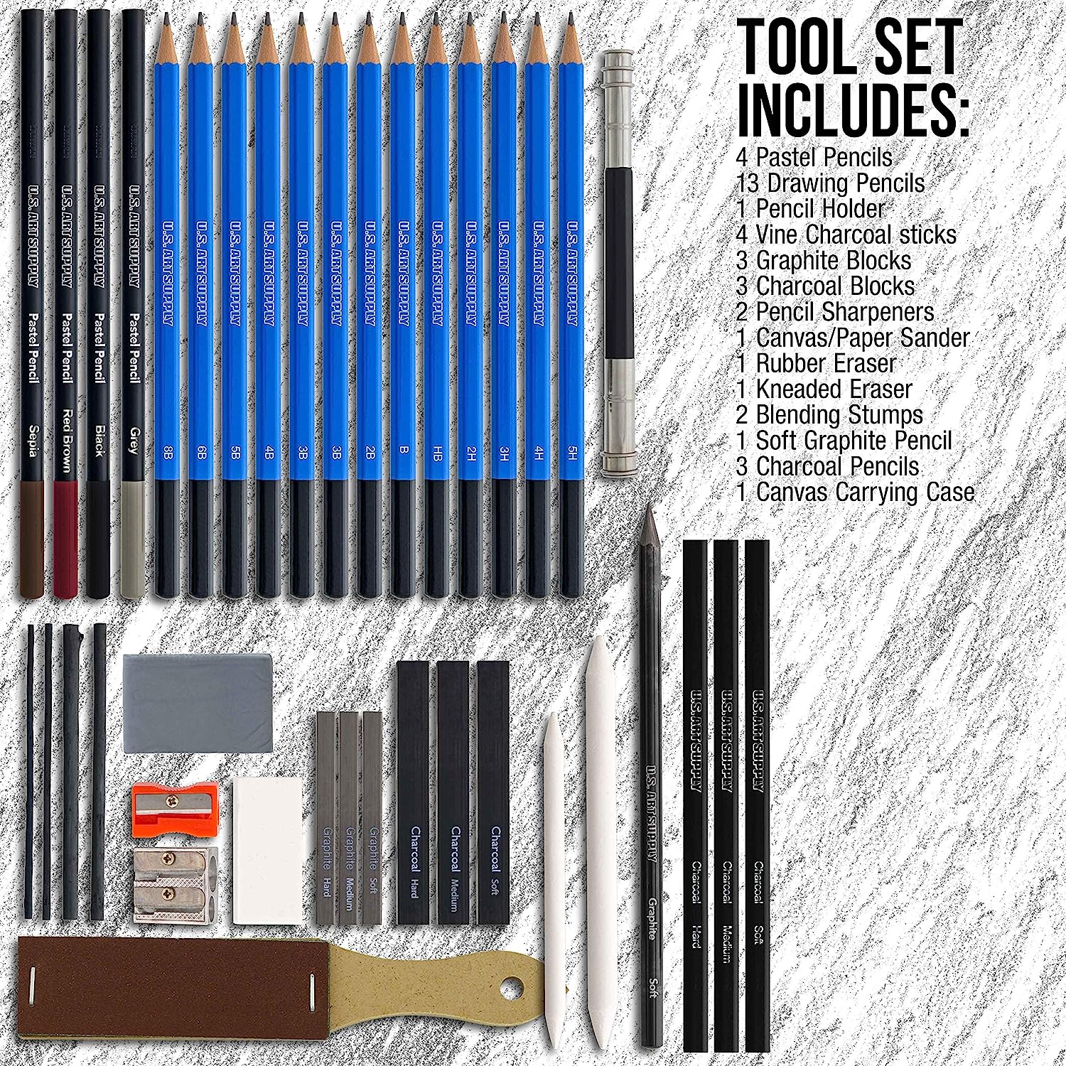 • This superior quality set includes 12 Graphite Pencils (shades from 5H hard to 8B soft), 3 Graphite Sticks (soft, medium, and hard grades), 1 Woodless Soft Graphite Pencil, 1 Plastic/Vinyl Eraser for Pencils, 1 Pencil Extender, 3 Charcoal Pencils (soft, medium and hard grades), 3 Charcoal Sticks (soft, medium and hard grades), 4 Charcoal Willow Sticks, 1 Kneaded Eraser for Charcoal