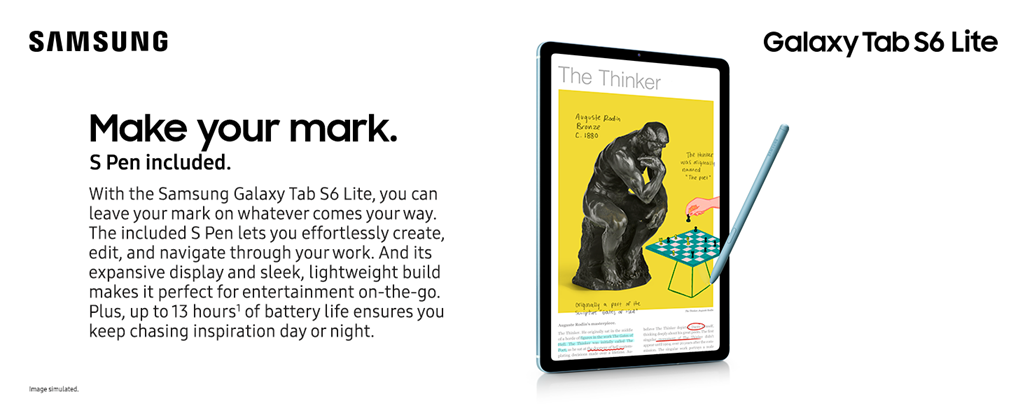 With the Samsung Galaxy Tab S6 Lite, you can leave your mark on whatever comes your way. The included S Pen lets you effortlessly create, edit, and navigate through your work. And its expansive display and sleek, lightweight build makes it perfect for entertainment on-the-go. Plus, up to 12 hours1 of battery life ensures you keep chasing inspiration day or night. ¹Battery power consumption depends on usage patterns. Results may vary.