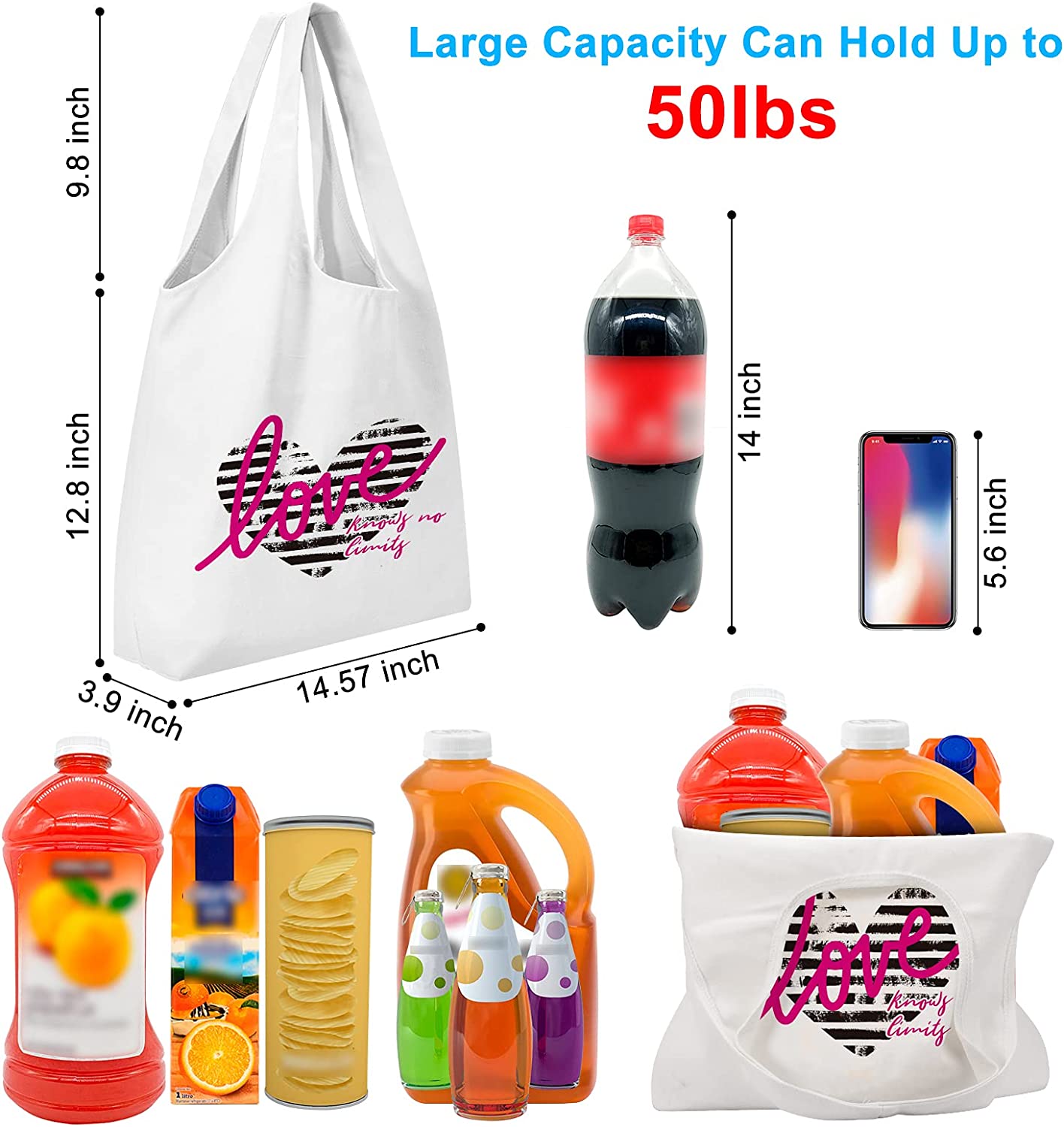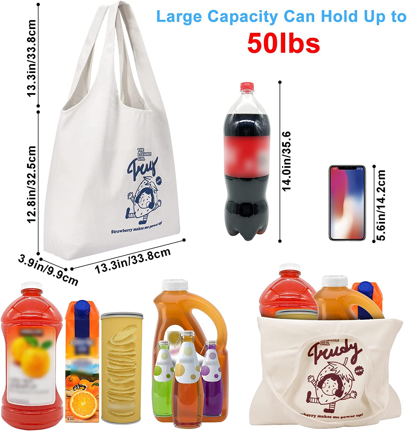 - X-Large Capacity: Canvas tote bags are very big which can hold up to 50+ pounds of groceries and replaces 2-3 conventional grocery bags. Long handles of the reusable shopping bags allow for hand holding or carry on the shoulder for easier carrying. The foldable aesthetic tote bag is perfect for shopping, groceries, travel, storage and practical for daily use.