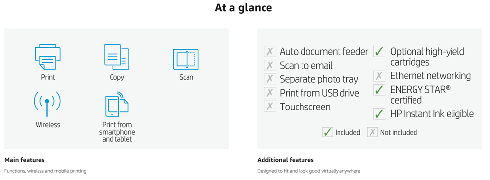 • Main functions of this HP DeskJet 3755 (3700 series) compact printer: copy, scan, wireless printing, AirPrint, Instant Ink ready so you'll never run out of ink