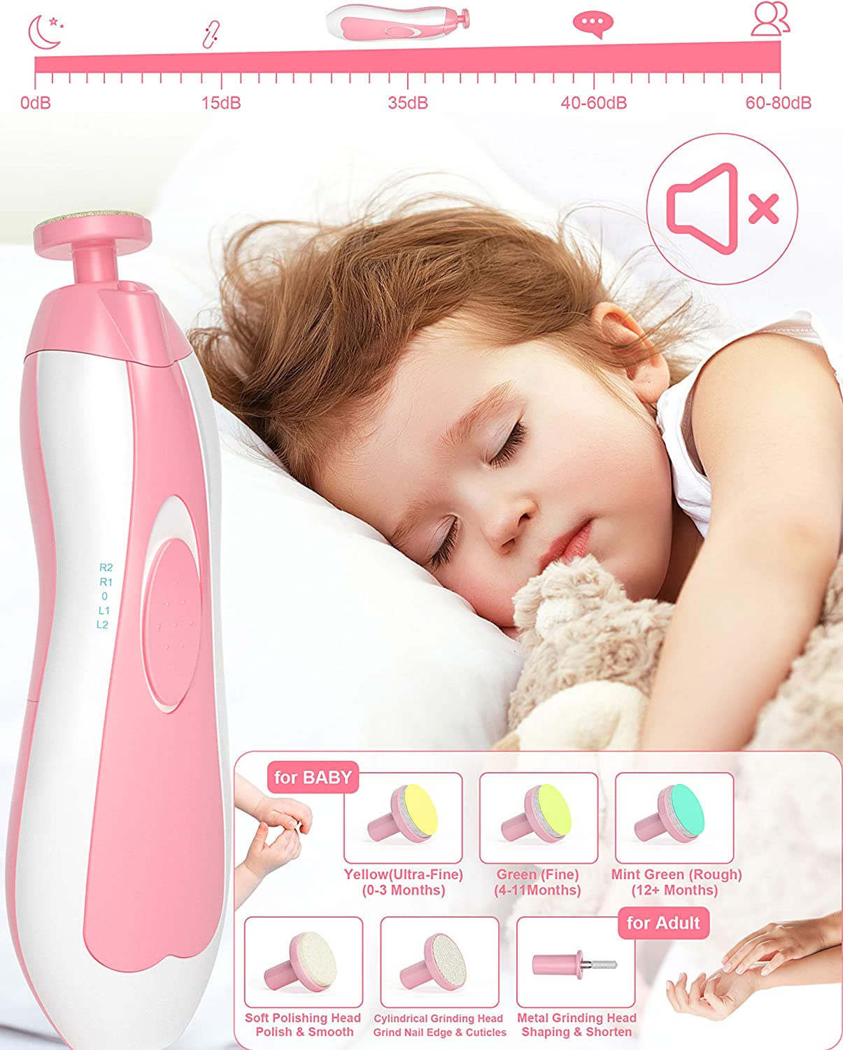 • ?[8 in 1 Electric Baby Nail Clippers Set] OTTOLIVES newborn grooming kit is equipped with 1 electric nail trimmer and 7 trimmer attachments (6 grinding heads & 1 metal nail files) The 6 grinding heads can satisfy the nail repair of babies at different ages without damaging the delicate epidermis or nail bed. In addition, this is also suitable for adults.