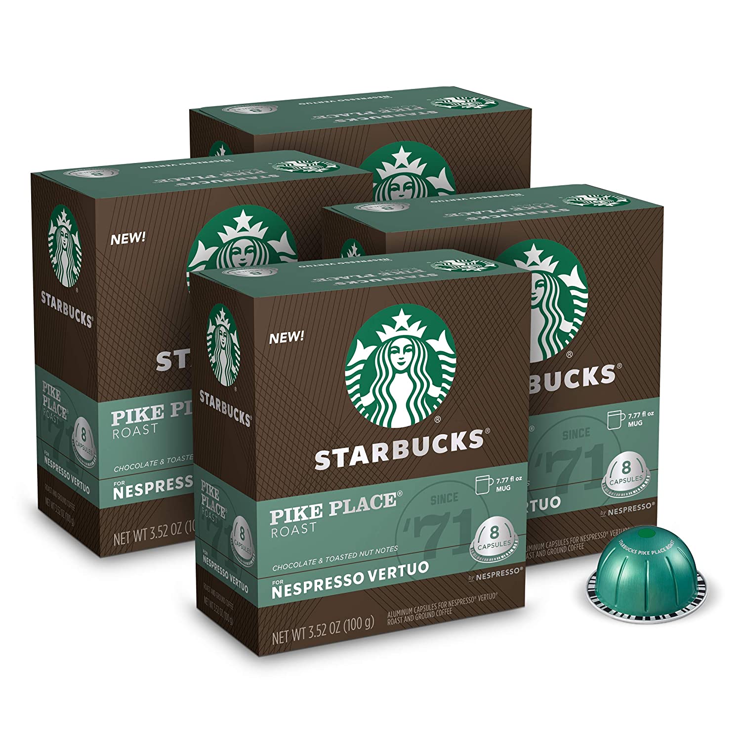 INCLUDES: Enjoy the Starbucks coffee you love with four boxes of 8 capsules of Starbucks Pike Place Roast medium roast coffee for a total of 32 capsules for Nespresso Vertuo machines