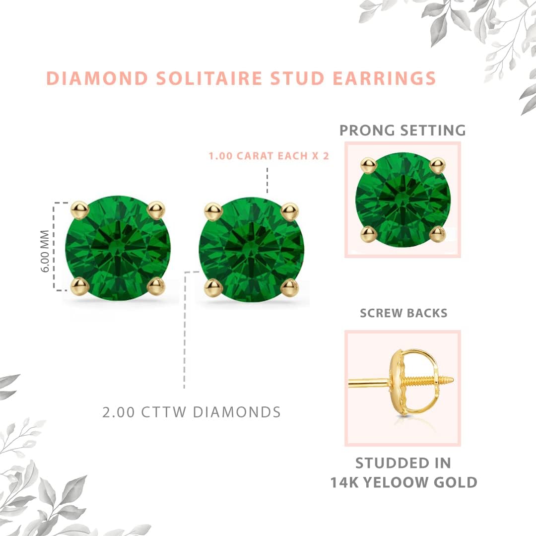 14K Yellow Gold 2.00 Carat Green Diamond Solitaire Stud Earrings for Women, Secure Screw-backs, 6mm, Hypoallergenic, Giftable Jewelry