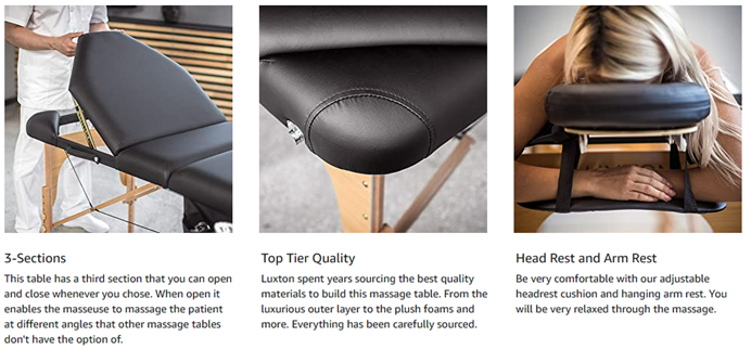 • THREE SECTION - This is a 3-Section Massage Table which enables you to receive or give massages at many more angles than the standard massage bed. You can lift up the third section and adjust and lock it at countless angles to ensure the optimal angle for any form of massage or therapy desired. Truly unique and customizable. Not to mention it is very easy to do this in moments.