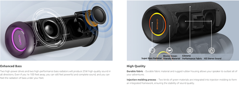 - [BRILLIANT SOUND WITH RGB COLORFUL LIGHT]: SOWO speaker Bluetooth wireless based on advanced DSP technology, surgeboom 2 is equipped with 25w stereo audio drivers and two wide bass passive radiators, which perfectly achieves stereo sound effect and high volume output. The radiator is also loaded with cool LED lights with dual 256-level brightness display.