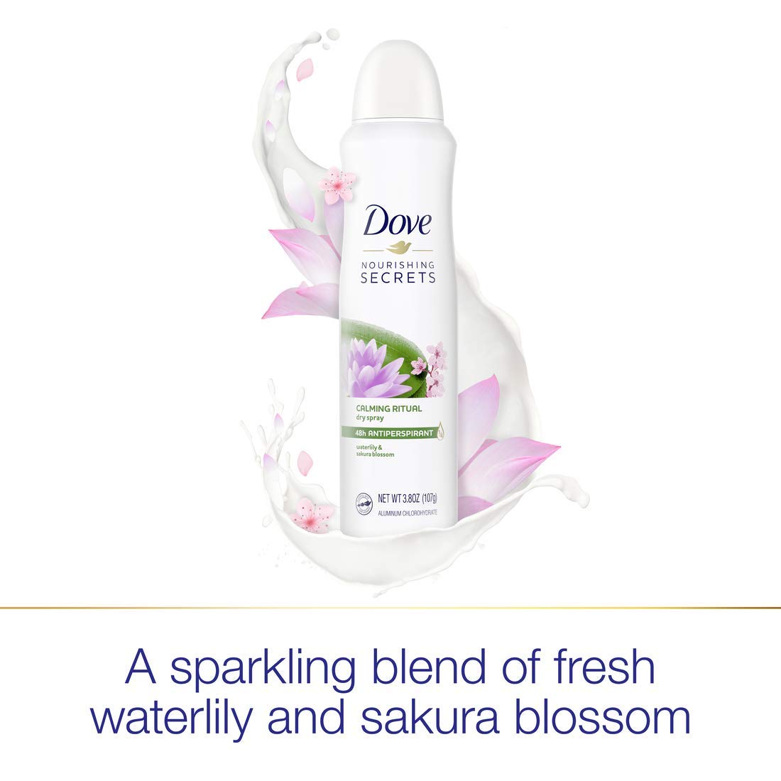Who doesn't dream about a calm morning routine? Our calming ritual dry Spray Antiperspirant Deodorant waterlily & Sakura blossom is just the thing to keep you feeling calm, comfortable and confident first thing in the morning, without compromising on care and all-day protection. This Dove Nourishing secrets dry Spray Antiperspirant Deodorant for women will help you transform your daily self-care routines into luxurious rituals. Inspired by self-care rituals of real women, Made with 0% alcohol (ethanol) and enriched with Dove 1/4 moisturizers, this non-irritating antiperspirant formula leaves you with comfortable, beautifully soft underarms while keeping underarm sweat and odor at bay for up to 48 hours. But that's not all. This dry spray combines the sophisticated, sparkling scents of waterlily and Sakura blossom with comforting notes of sandalwood in a nature-inspired fragrance that's been created with responsibly sourced ingredients - so you can enjoy a calming ritual without compromising on care. It'll infuse your days with a small, but indulging ritual that's there for you and you alone, no matter what. For best results, Spray each underarm with two or three short bursts from about 6 inches away. Apply this Dove Antiperspirant Deodorant to dry skin after showering and enjoy fresh, comfortably dry skin from morning to night. This antiperspirant deodorant spray dries instantly, so you don't have to wait or worry.