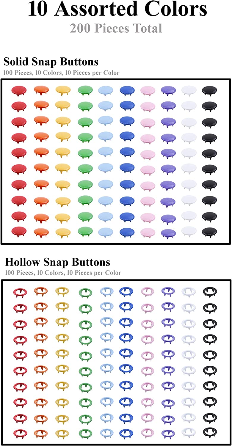Button snaps starter set in bulk; 804 pieces total; 20 sets each color; 200 sets total; Button diameter: 9.5 mm or 0.37 In; Plier length: 6 Inches; Color: red, white, black, green, pink, light blue, blue, yellow, orange, purple