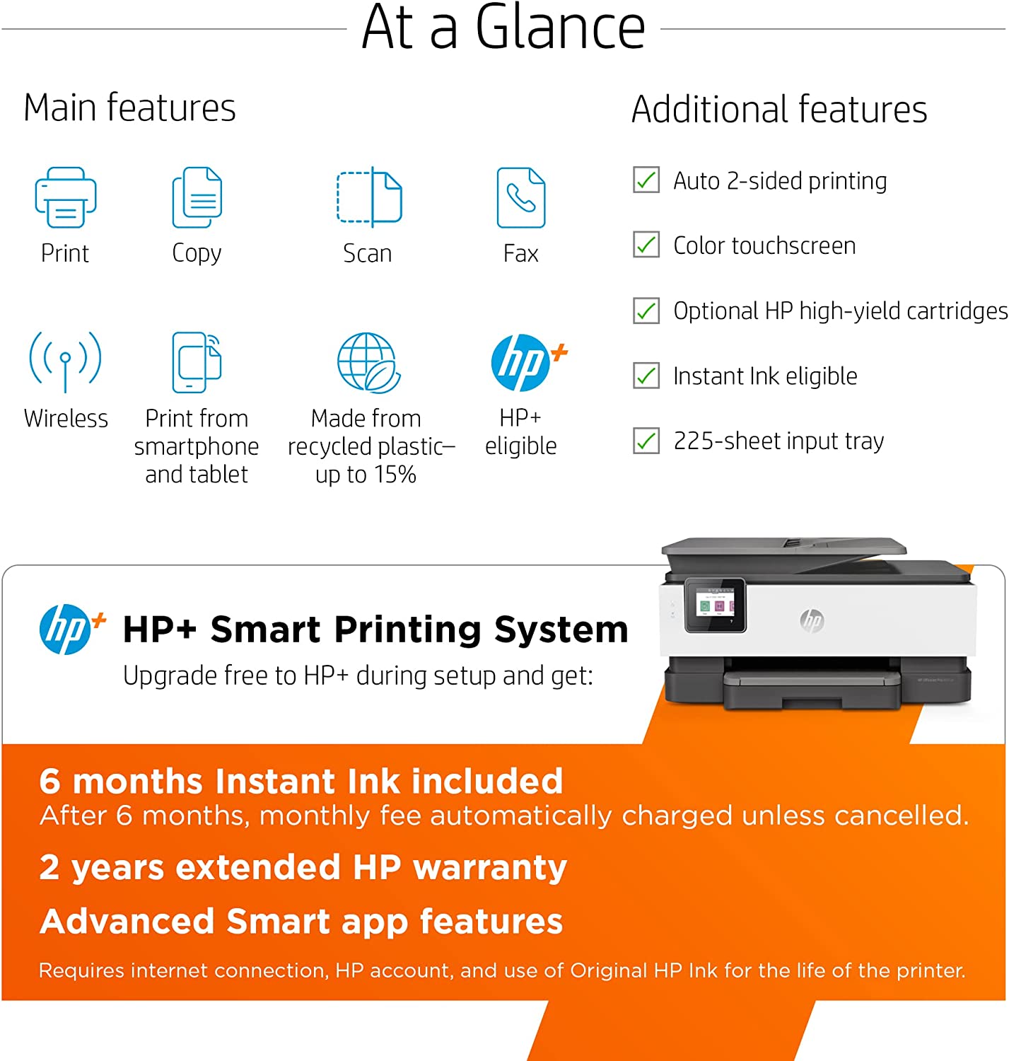INCLUDES FREE HP+ SMART FEATURES – Activate HP+ free to get advanced features for mobile printing, security, automatic updates and more. HP+ only works with an HP account, internet connection and Original HP Ink for the life of the printer.