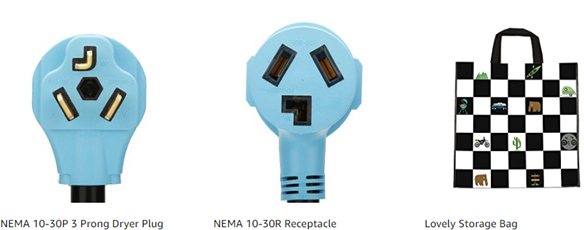 - 【ELECTRICAL RATING】 30A, 125/250V, max wattage 7500 watts, 10 feet, STW NEMA 10-30P male plug and NEMA 10-30R female receptacle, for 3 prong dryer outlet.