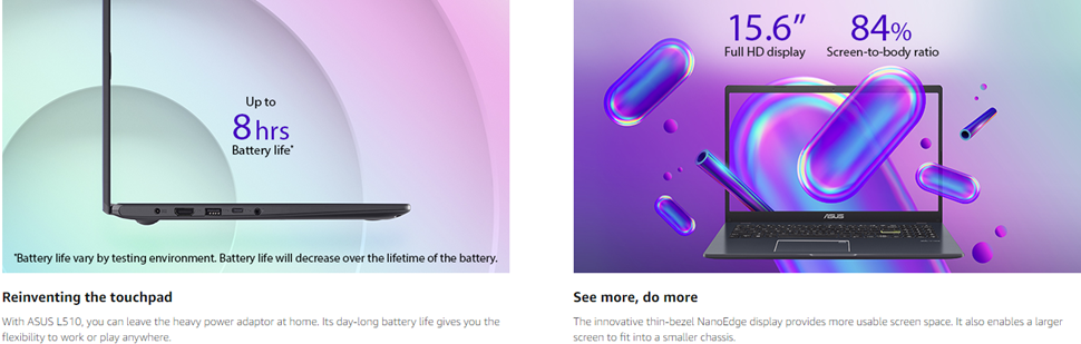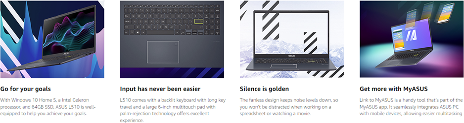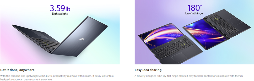 The ASUS Laptop L510MA is designed to help you be productive all day — even when you’re on the move. This compact and lightweight 14 inch laptop is powered by the latest Intel® processor and provides long lasting battery life. With eMMC storage and pre-loaded Windows 10 in S mode, it offers full compatibility with a wide range of software and peripherals. It’s the best laptop for people on the go. *The actual transfer speed of USB 3.0, 3.1, 3.2 (Gen 1 and 2), and/or Type-C will vary depending on many factors including the processing speed of the host device, file attributes and other factors related to  system configuration and your operating environment. For Free Windows 11 upgrade eligible devices, visit ASUS Windows 11 website for more information.
