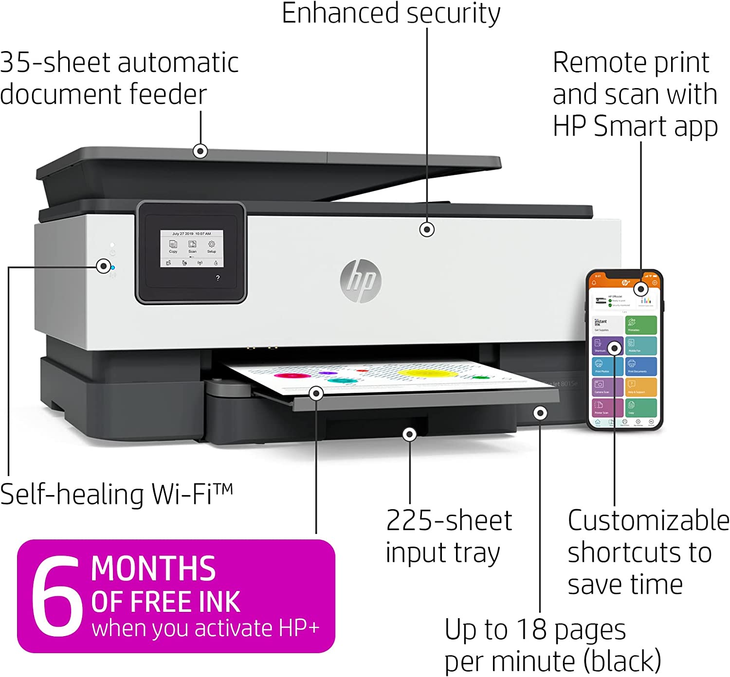 INCLUDES FREE HP plus SMART FEATURES – Activate HP plus free to get advanced features for mobile printing, security, automatic updates and more. HP plus only works with an HP account, internet connection and Original HP Ink for the life of the printer
