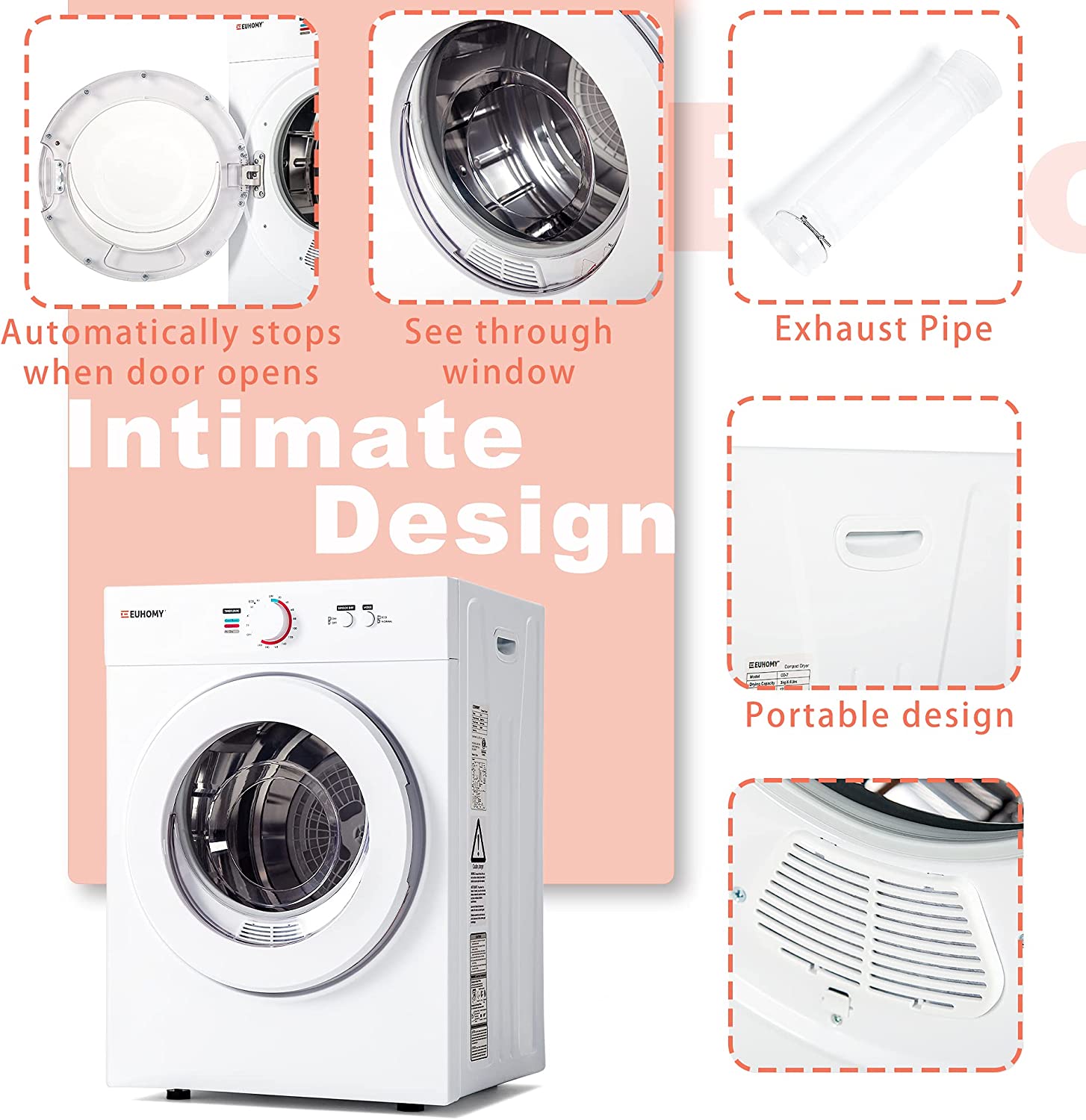 - 【High performance】This is powerful yet compact clothes dryer machine, euhomy portable dryer has a large capacity of 10.5 pounds(wet clothes). This dryer with 1050W power, It can reach a maximum temperature of 140°F, To ensure that your clothes dry quickly. Note: Use after spin-drying, the drying effect is better./The dryer can serve two people/If you have more space needs, you can buy other products of this brand.