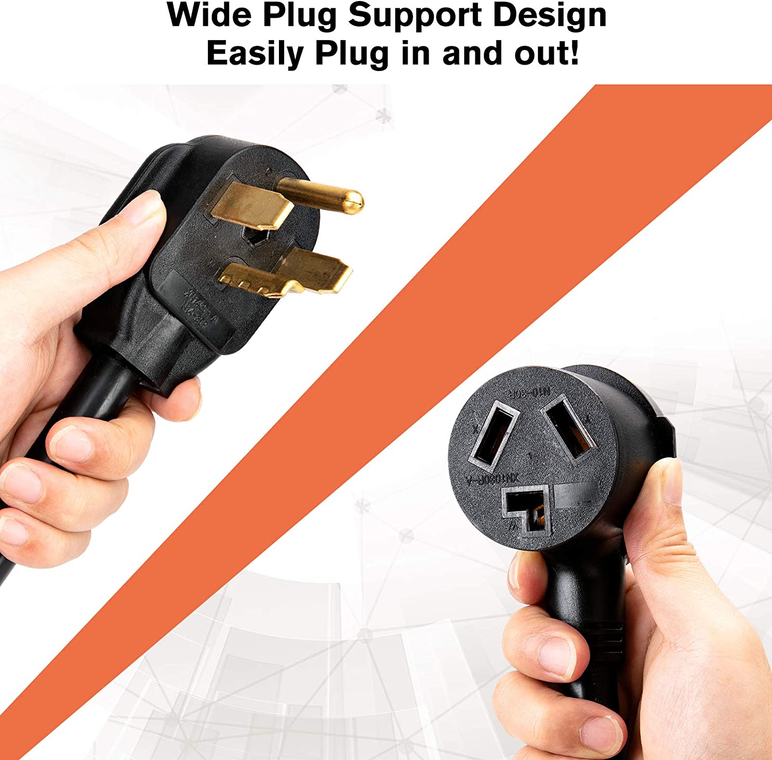 - 【Flexiblity】: Come with longer and wide extension 4 prong dryer cord that plug in or pull out plugs/sockets easily. And the cord can be bent 180 degrees from male to female flexibly. Molded right Angle Plug and Receptacle come with easy grip design.
