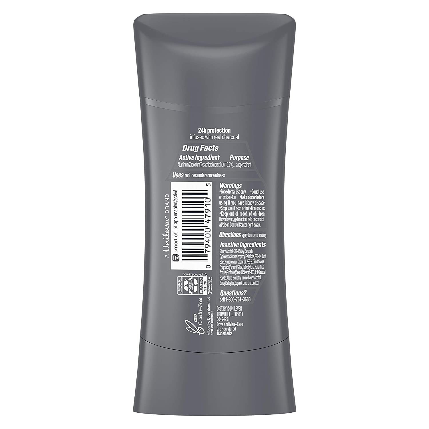 A natural inspired deodorant with 48-hour protection against sweat and odor, and lasting freshness - that's the Dove Men+Care antiperspirant with Charcoal. For men who want protection that works through busy, active days, this antiperspirant deodorant for men is made to leave you feeling purified and dry for a full 48 hours. This antiperspirant is one of the strongest defenses against sweat and odor, with natural essential oil extracts, plant-based moisturizers and the purifying feeling of Charcoal. This deodorant offers long-lasting performance and comfort because it's tough on sweat, but not on the skin. Swipe with ease to experience a smooth glide and keep your underarms feeling clean for the long-lasting protection that you need. You can also rest assured that Dove's global commitment to sustainability means this deodorant is cruelty-free, with no testing done on animals. To complete your grooming routine, explore the entire Dove Men+Care Plant-Based Care range. Whether it's the Dove Men + Care Charcoal Clove Body Wash or the Dove Men + Care Eucalyptus+ Birch, there are many options to pair this deodorant with. You can also choose from Dove Men + Care 0% Aluminum deodorant sticks and sprays available in invigorating scents like Lime + Sage and soothing ones like Sandalwood + Orange.Un desodorante de inspiración natural con protección de 48 horas contra el sudor y el olor, y frescura duradera, es el antitranspirante Dove Men+Care con carbón vegetal. Para los hombres que quieren una protección que funcione durante días ocupados y activos, este desodorante antitranspirante para hombres está hecho para dejarte purificado y seco durante 48 horas. Este antitranspirante es una de las defensas más fuertes contra el sudor y el olor, con extractos naturales de aceites esenciales, humectantes a base de plantas y la sensación purificadora de carbón. Este desodorante ofrece un rendimiento duradero y comodidad porque es resistente al sudor, pero no a la piel. Desliza con facilidad para experimentar un deslizamiento suave y mantener las axilas con una sensación limpia para la protección duradera que necesitas. También puede estar seguro de que el compromiso global de Dove con la sostenibilidad significa que este desodorante está libre de crueldad, sin pruebas realizadas en animales. Para completar su rutina de aseo de limpieza, explore toda la gama Dove Men+Care Plant-Based Care. Ya sea el lavado corporal Dove Men + Care Charcoal Clove o el Dove Men + Care Eucalyptus+ Birch, hay muchas opciones para combinar este desodorante. También puedes elegir entre palillos desodorantes y aerosoles Dove Men + Care 0% aluminio disponibles en aromas estimulantes como lima + salvia y calmantes como sándalo + naranja.