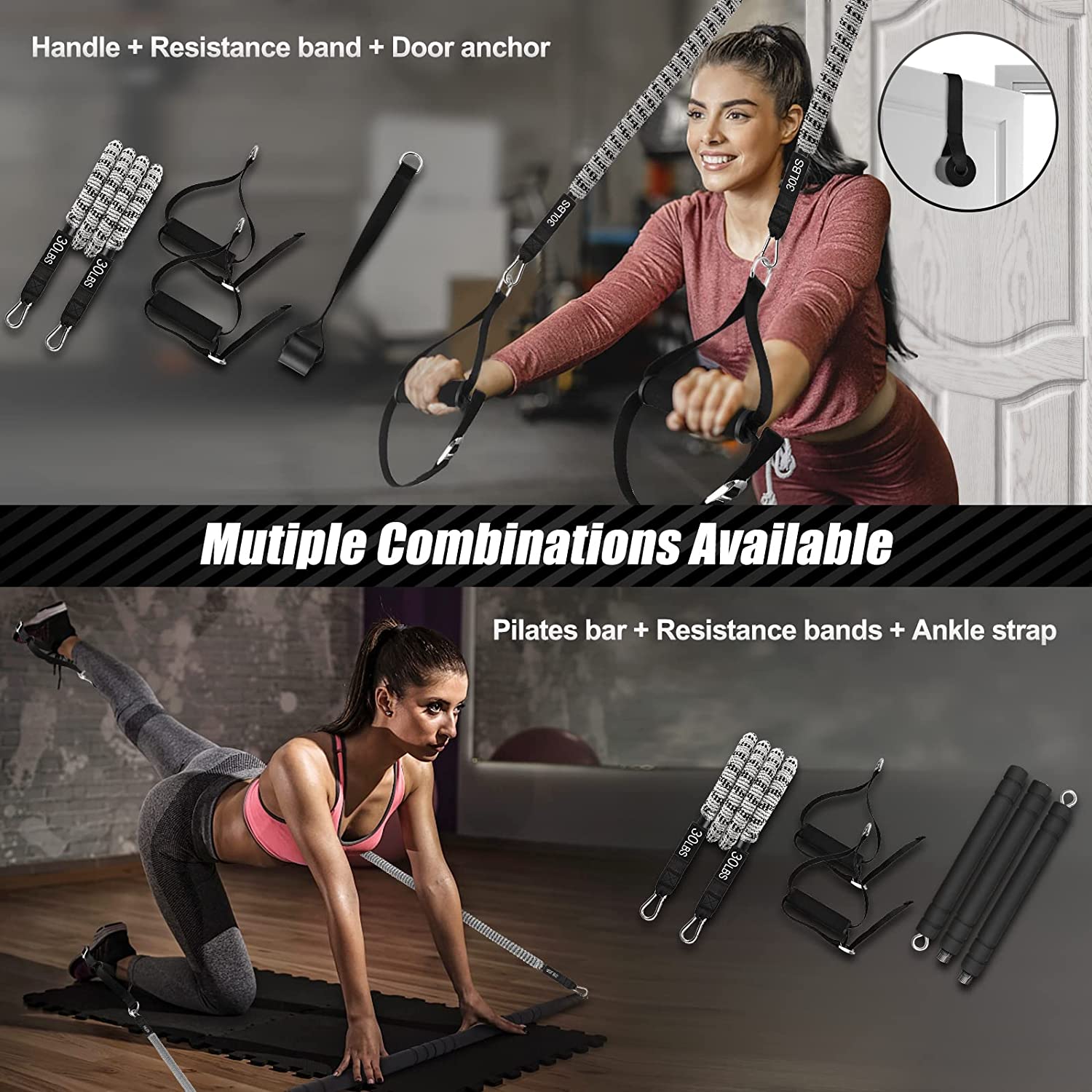 • ✅ 『Take Portable Gym Anywhere』Detachable pilates workout bar crafted with three-section steel sticks, just needs to rotate the screw and connect full bar length to be 38.8inches. It is very easy to set up and disassemble. The resistance bands come with metal buckles, so you change and take off them from the pilate bar conveniently. Lightweight and Portable design allows you to store them without taking up a lot of space, and exercise at home, in the office, on travel, vacation, etc.