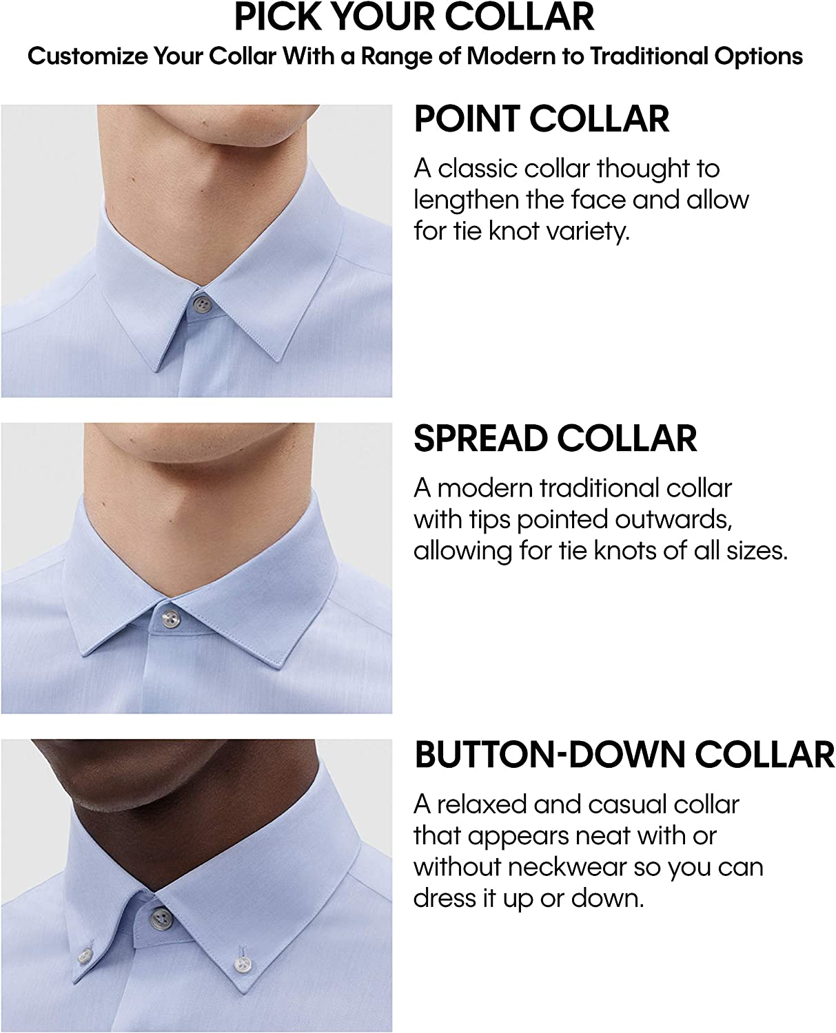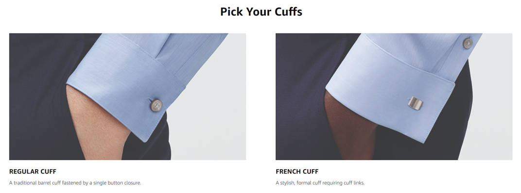 • Your choice between 3 collars & 2 cuffs: select a spread, point or button-down collar, and whether you want 2-button adjustable barrel cuffs or French cuffs to show off your best cufflinks