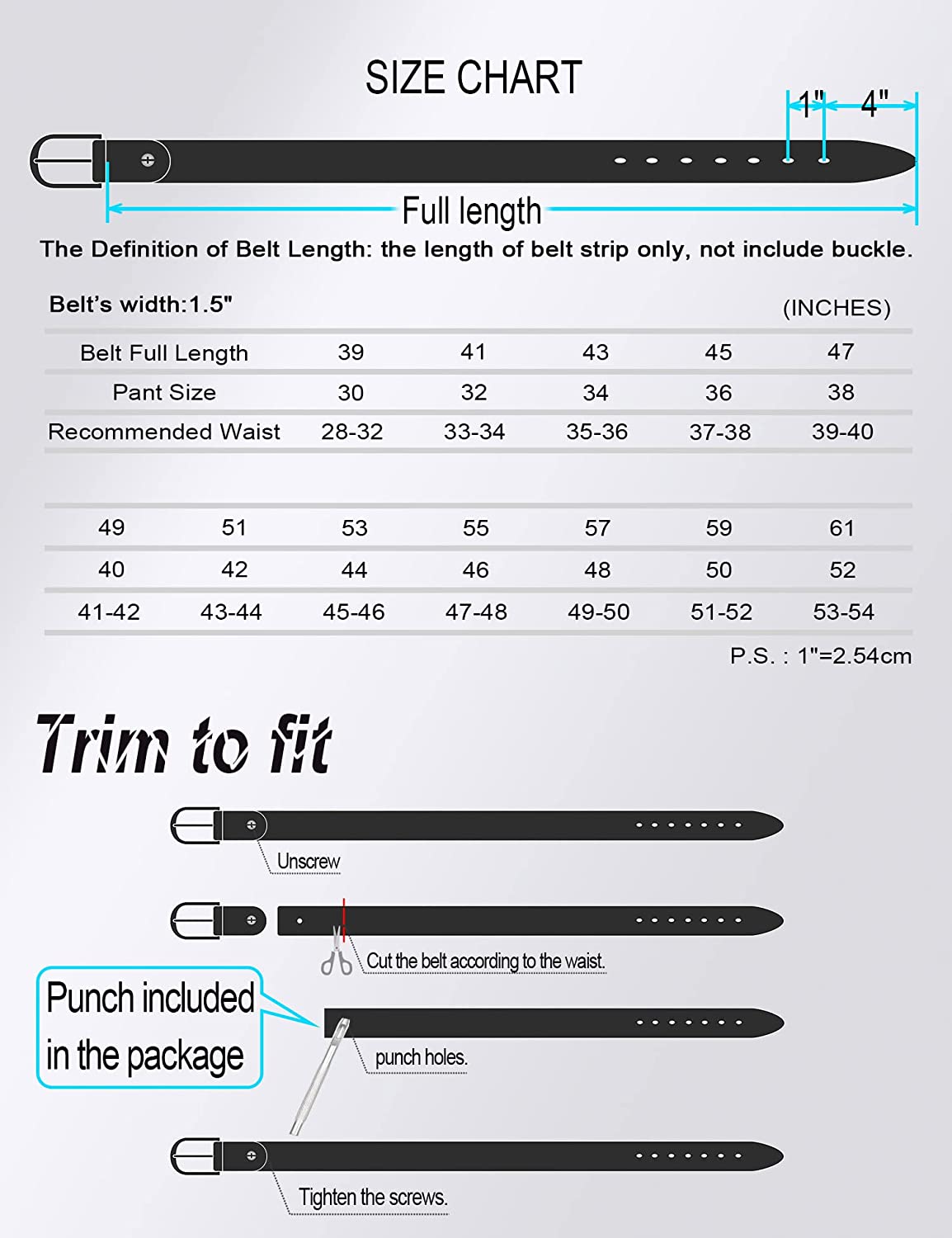 • [Perfect Fit]: There are 7 holes on the mens belt to make belt fits more waistline size. Each product comes with a puncher so that you can remove the belt head to adjust the belt length according to your waist size.
