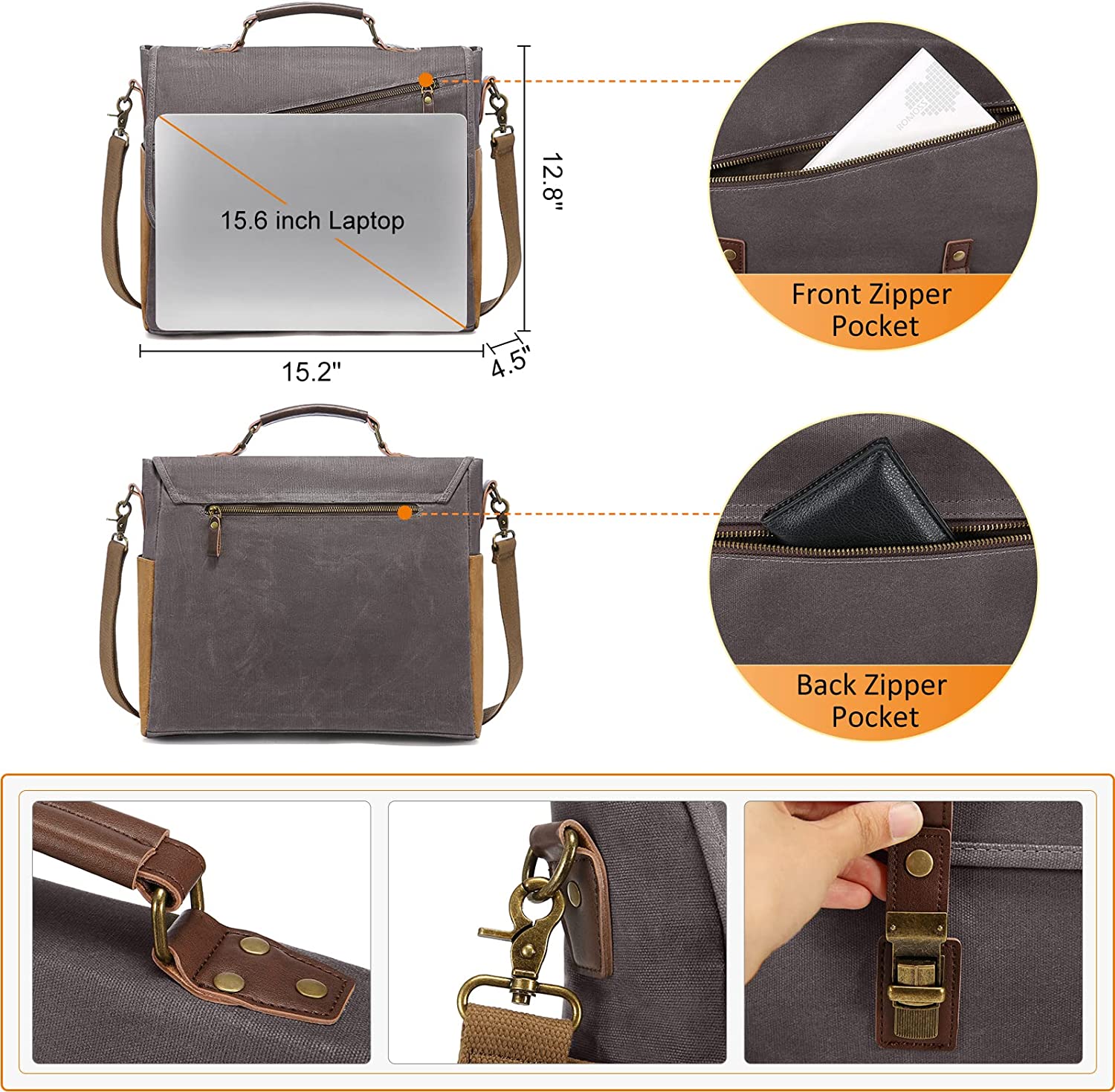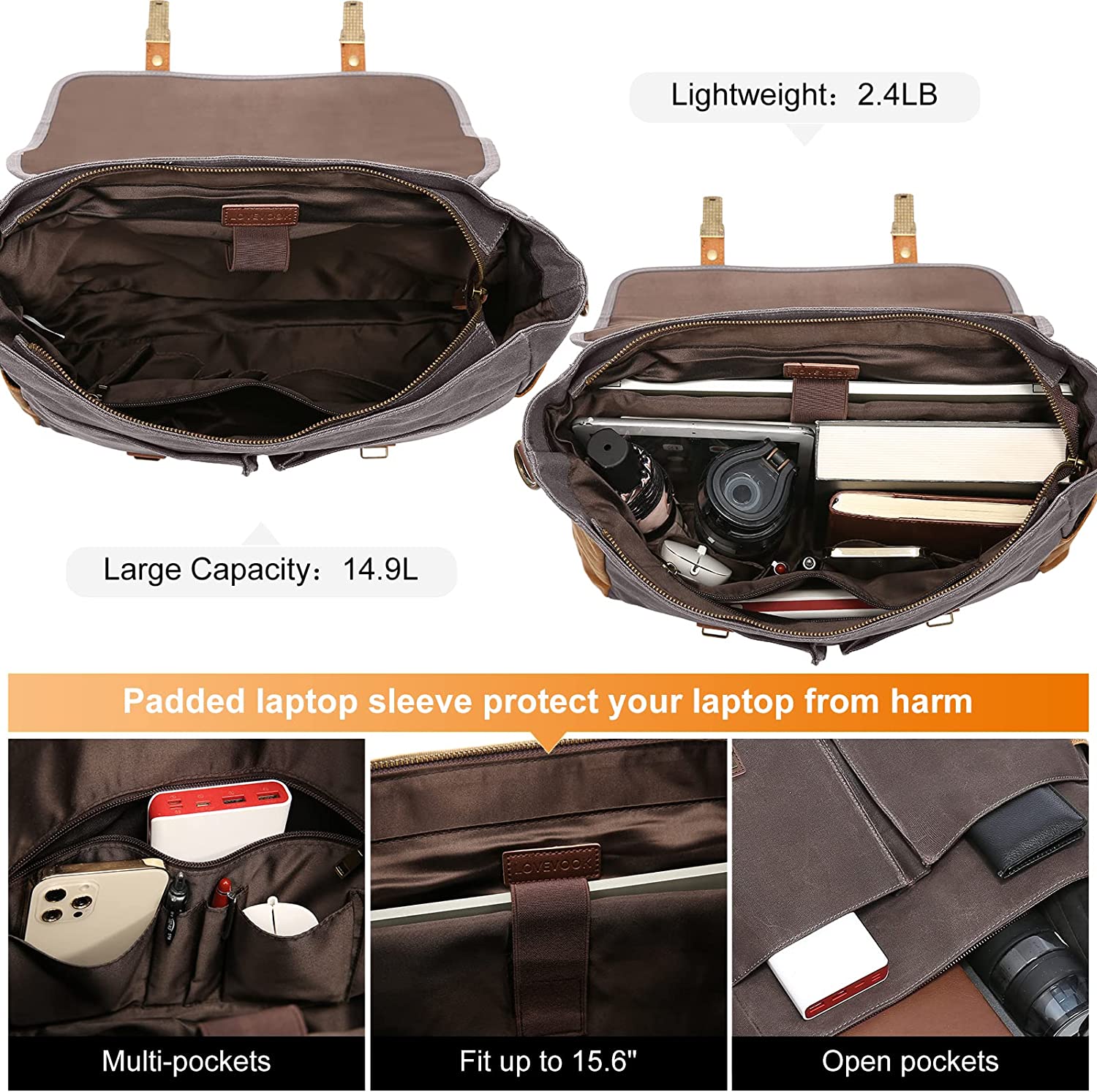 LOVEVOOK Mens Messenger Bag, 15.6 Inch Waterproof Waxed Canvas Briefcase Vintage Leather Computer Laptop Book Bag Large Satchel Shoulder Bag for Work, Travel, School