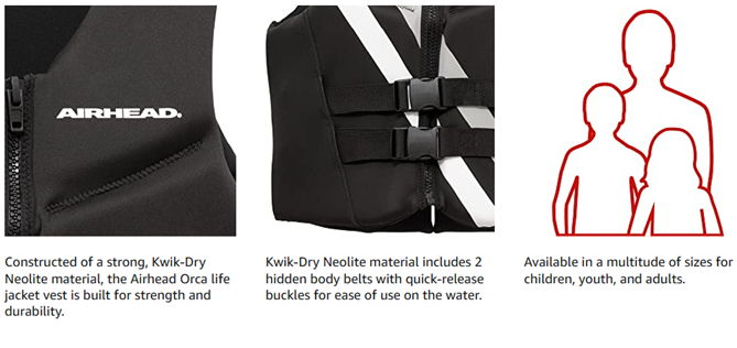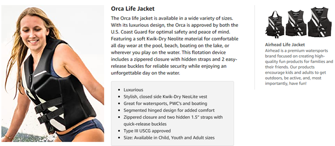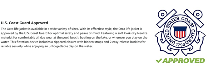 | Model Name | Orca Neoprene Kwik-Dry Neolite Life Jacket, USCG Approved Adult, Youth and Child Sizes |