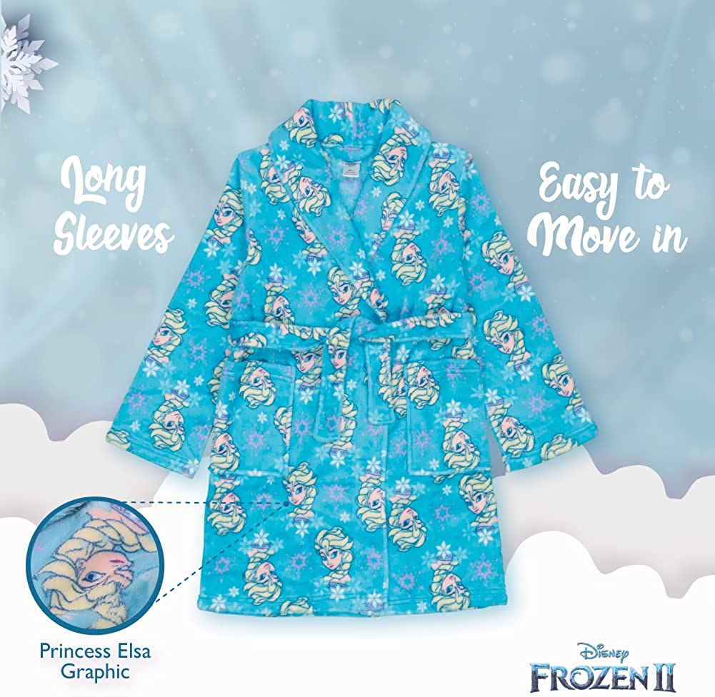 ENJOYABLE GIRLS’ BATHROBE: Our fun Disney “Frozen” plush robe is soft and loose-fitting and features charming, detailed graphics of Elsa. This cute and comfortable bathrobe for girls is available in sizes 2T–4T and 4–10.