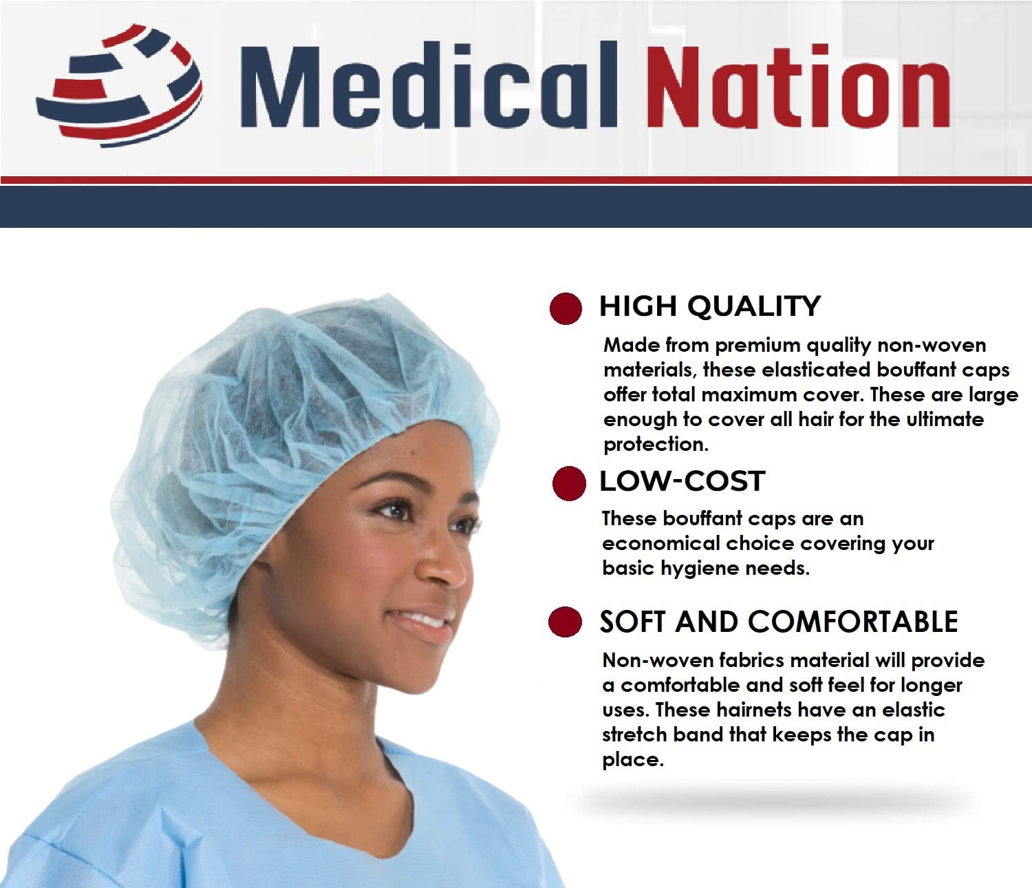 • MEDICAL NATION BOUFFANT CAPS: Nurses cap is a necessary piece of personal protective clothing for any clinic, hospital, laboratory or exam room. These head covers cover your hair maintaining proper hygiene safety. Size: 24". Quantity: 100 caps.