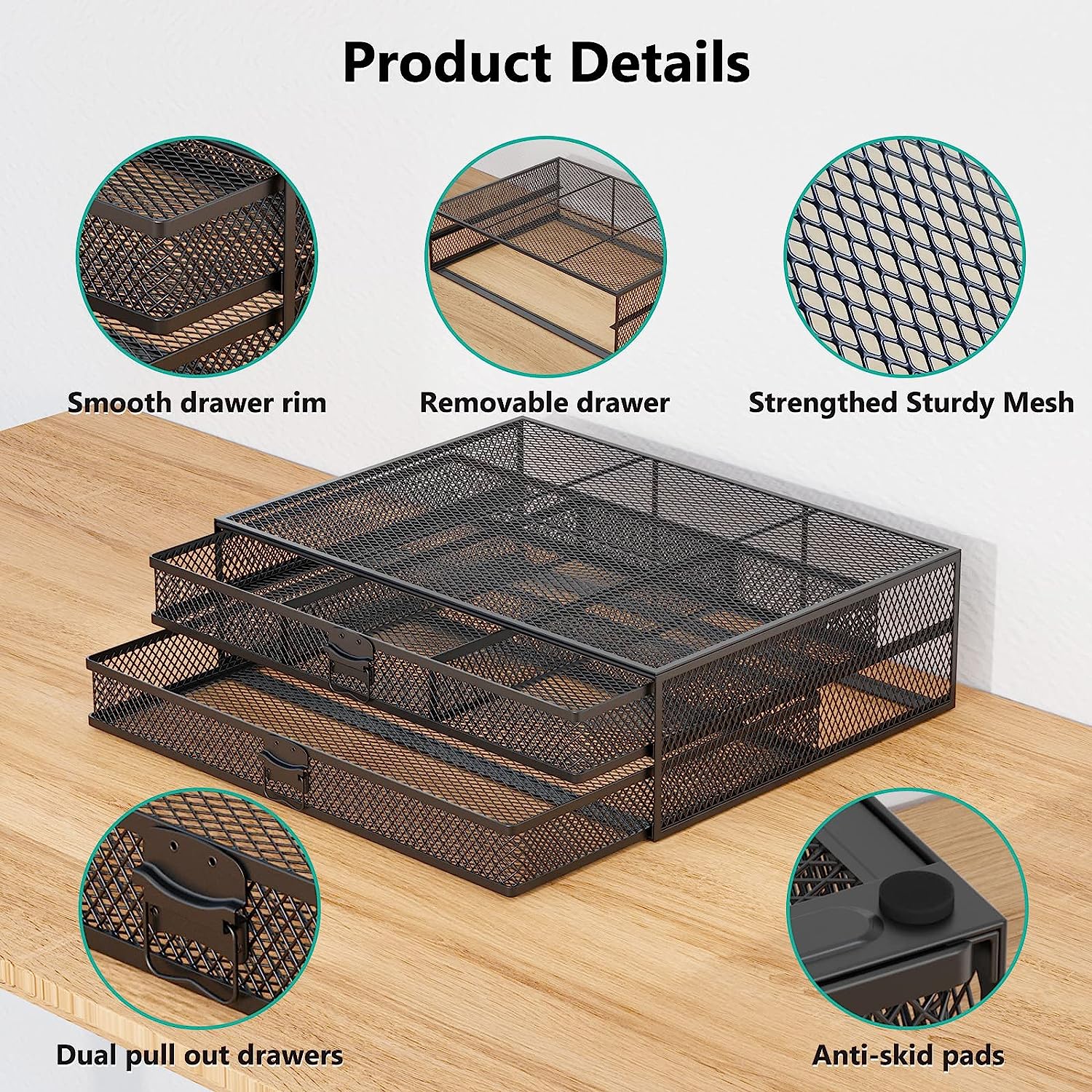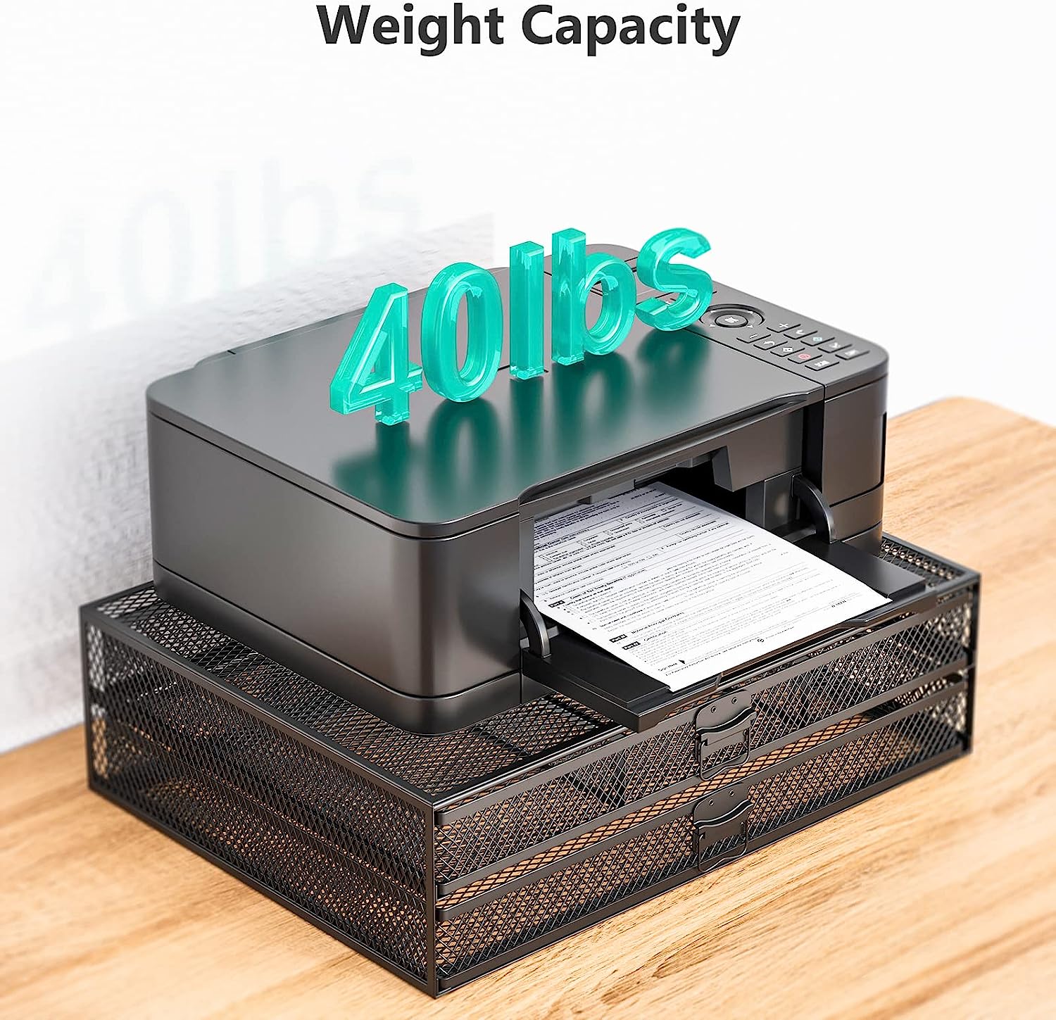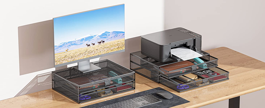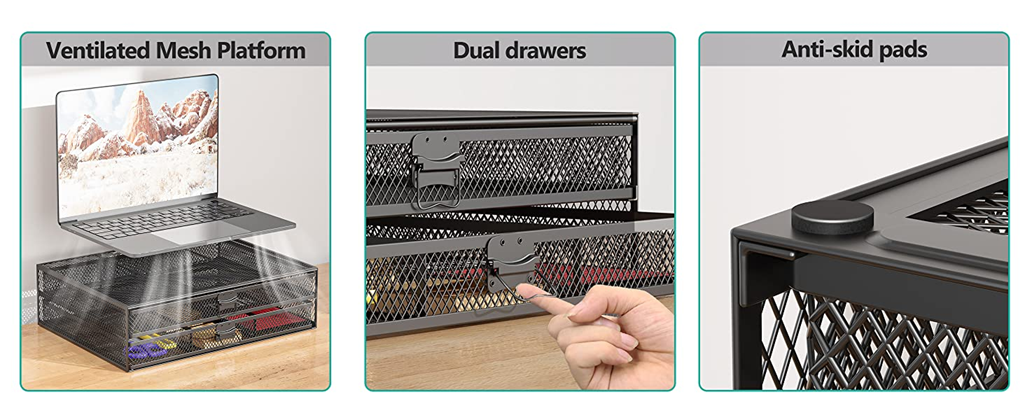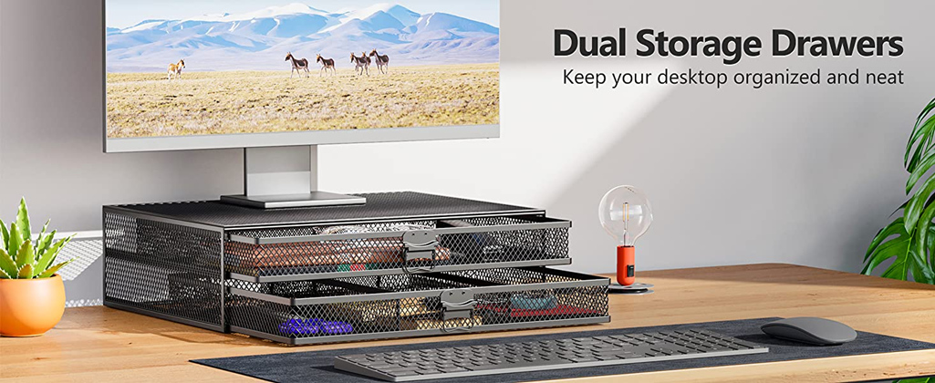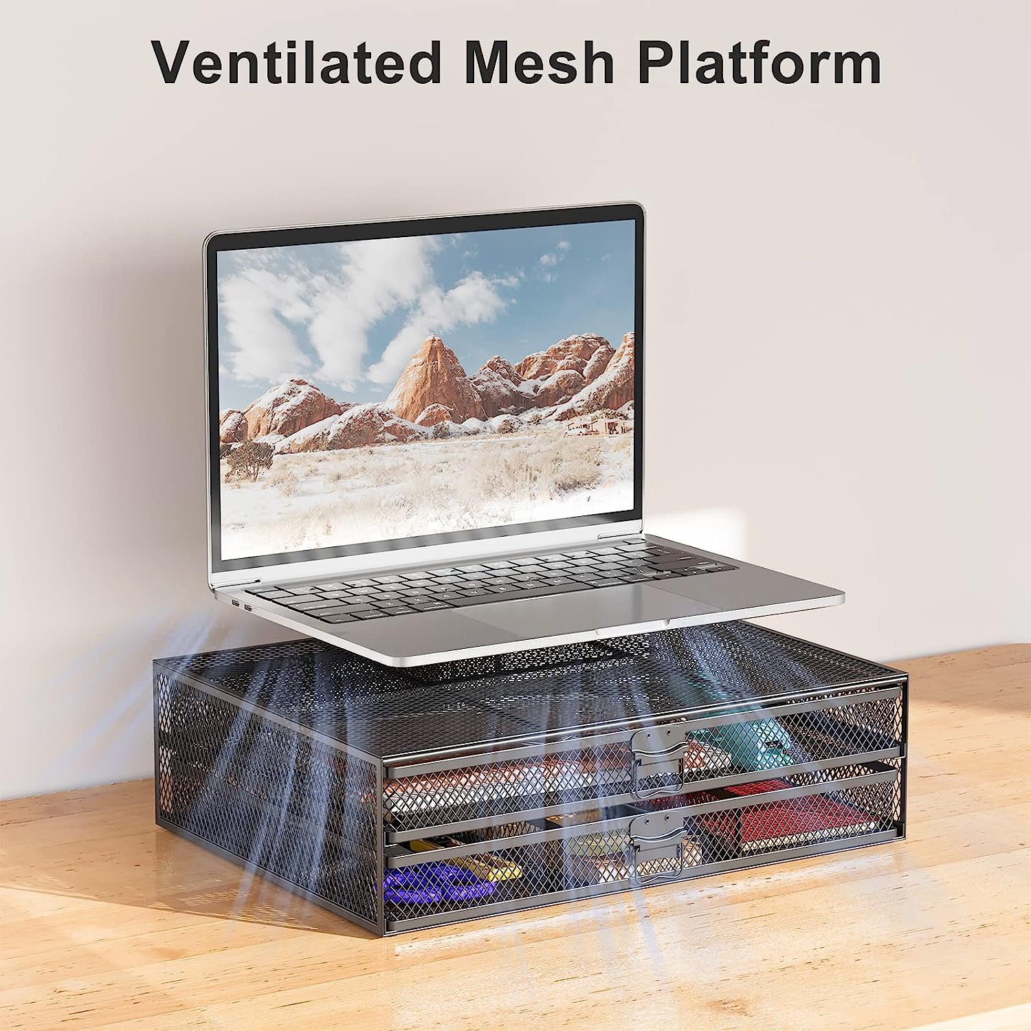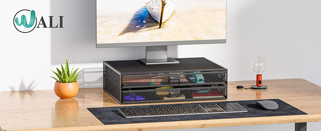WALI Metal Mesh Monitor Riser Desktop Stand with Storage Drawers for Computer, Laptop, LED, LCD, OLED Flat Screen Display, and Printer (STT006-B), Black